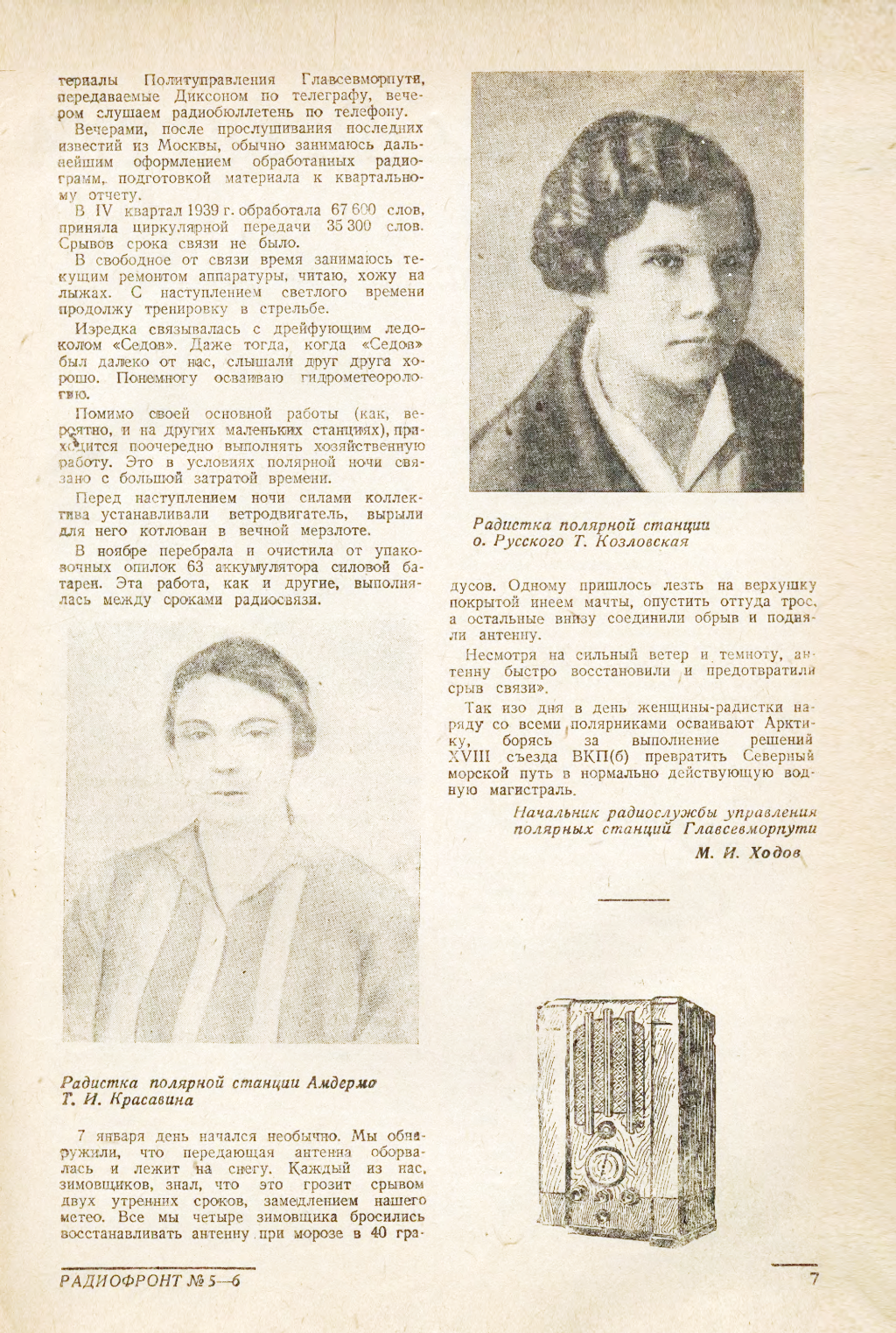 Тов. Козловская отлично обслуживает радиосвязью суда и самолеты. За свою образцовую работу она получила несколько благодарностей и одну из них лично от т. Папанина.