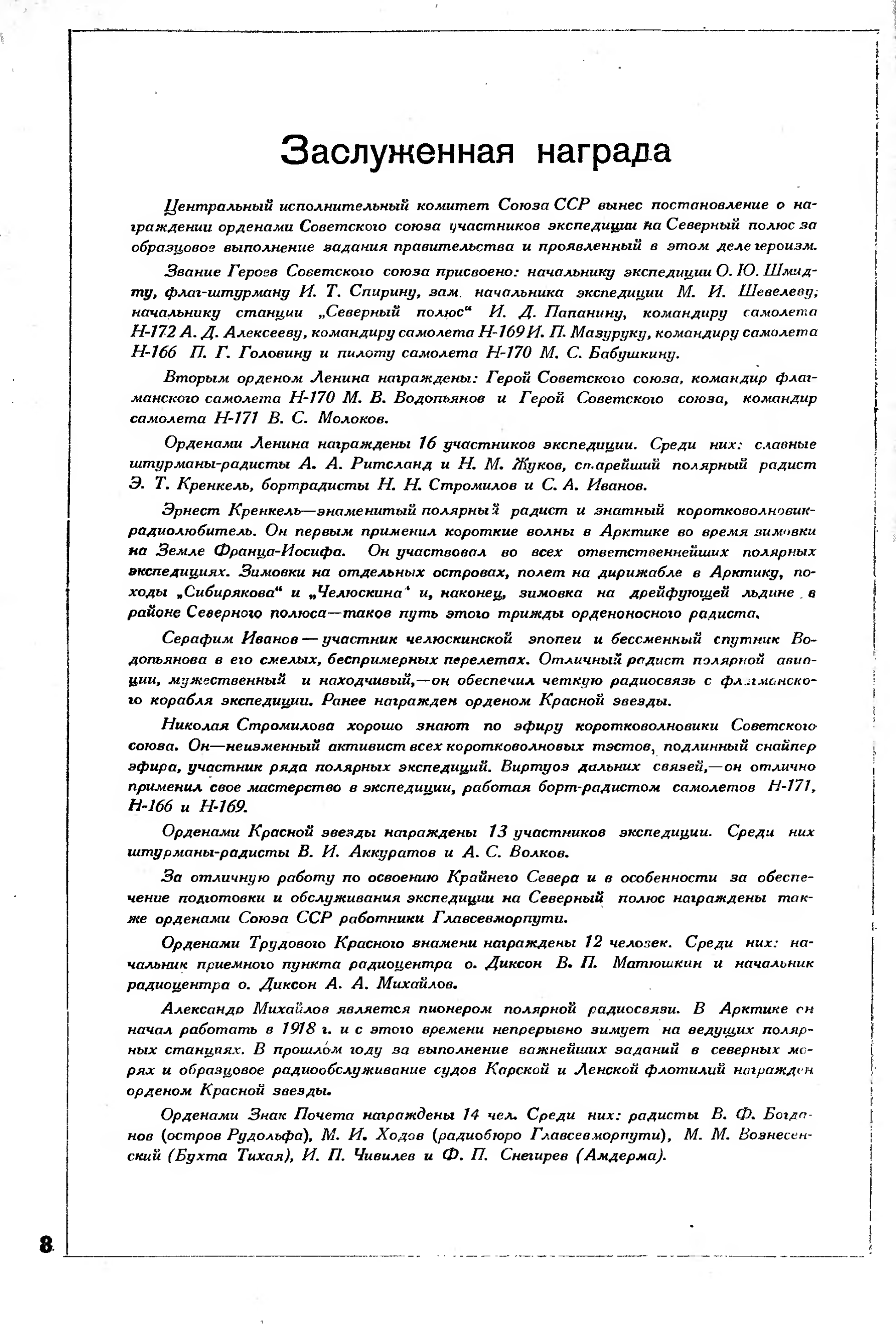 Блестящий пример челюскинцев и их спасателей заражает боевой отвагой нашу молодежь, кадры советского радиолюбительства. Получить орден Красной звезды для советского радиолюбителя — высокая честь, это лучшая награда за свои заслуги на радиофронте.