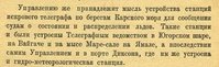 ТУРУХАНСК, 2. Постройка радиостанции в Подкаменной Тунгуске в в Имбатском закопчена. В Туруханске оборудование станции закончено, заканчивается установка двух дизелей по восьми сил и десяти—киловатного передатчика. Одновременно производится установка двух-киловаттного искрового передатчика для местной связи. Станция пускается в средине апреля.