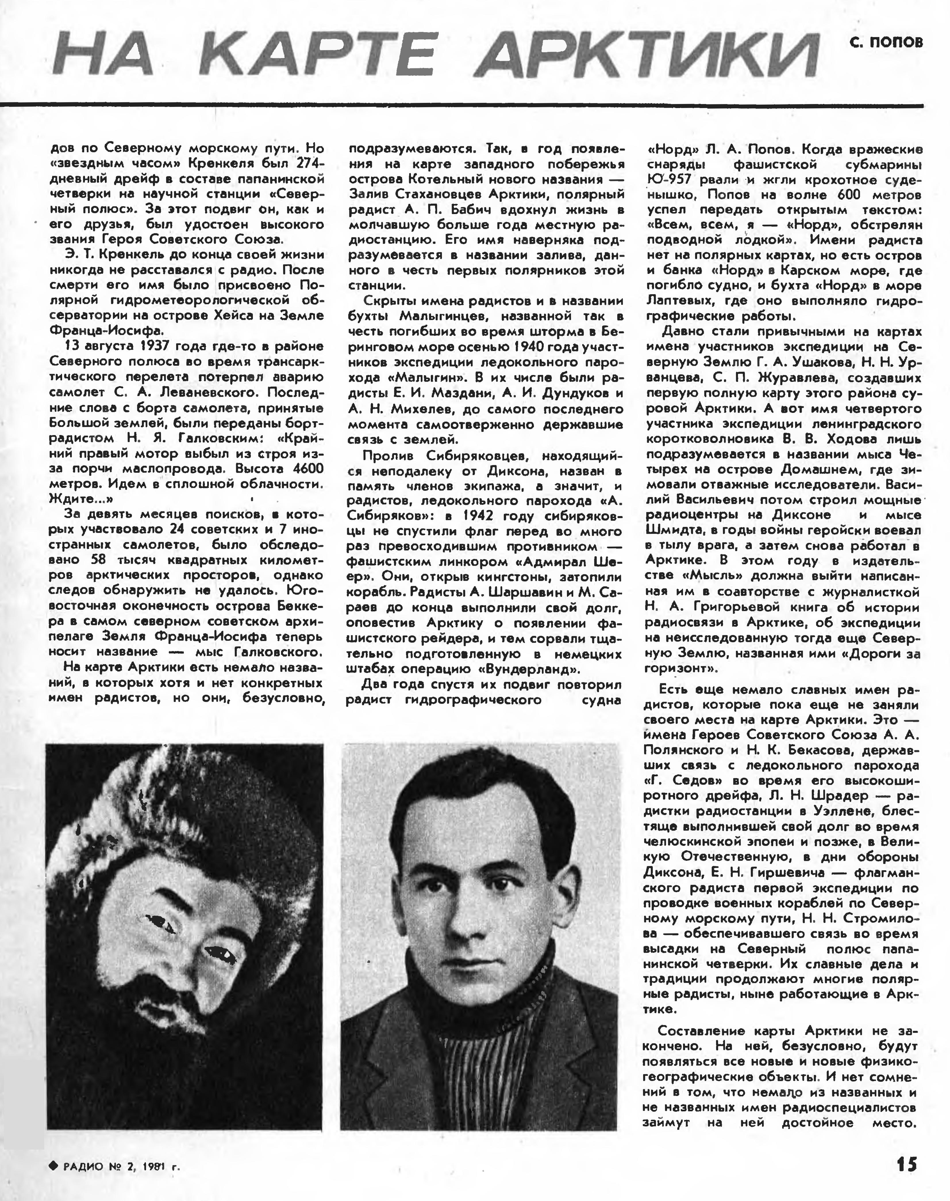 Есть еще немало славных имен радистов, которые пока еще не заняли своего места на карте Арктики. Это — имена Героев Советского Союза А. А. Полянского и К К. Бекасова, державших связь с ледокольного парохода «Г. Седов» во время его высокоширотного дрейфа, Л. Н. Шрадер — радистки радиостанции в Уэллене, блестяще выполнившей свой долг во время челюскинской эпопеи и позже, в Великую Отечественную, в дни обороны Диксона, Е. Н. Гиршевича — флагманского радиста первой экспедиции по проводке военных кораблей по Северному морскому пути, Н. Н. Стромилова — обеспечивавшего связь во время высадки на Северный полюс папанинской четверки. Их славные дела и традиции продолжают многие полярные радисты, ныне работающие в Арктике.