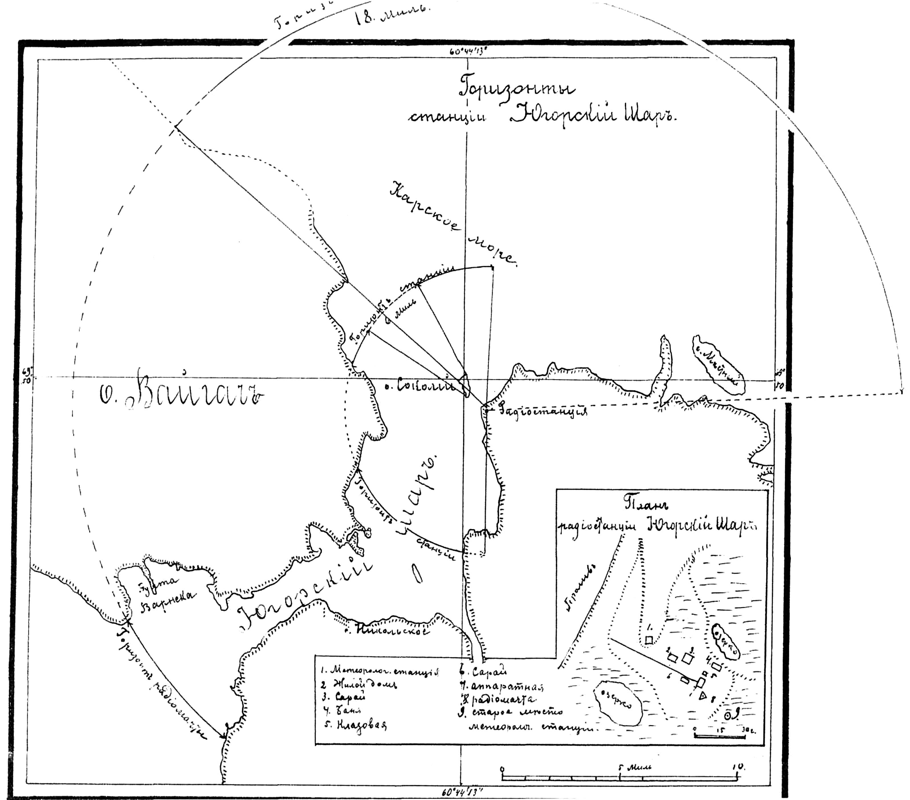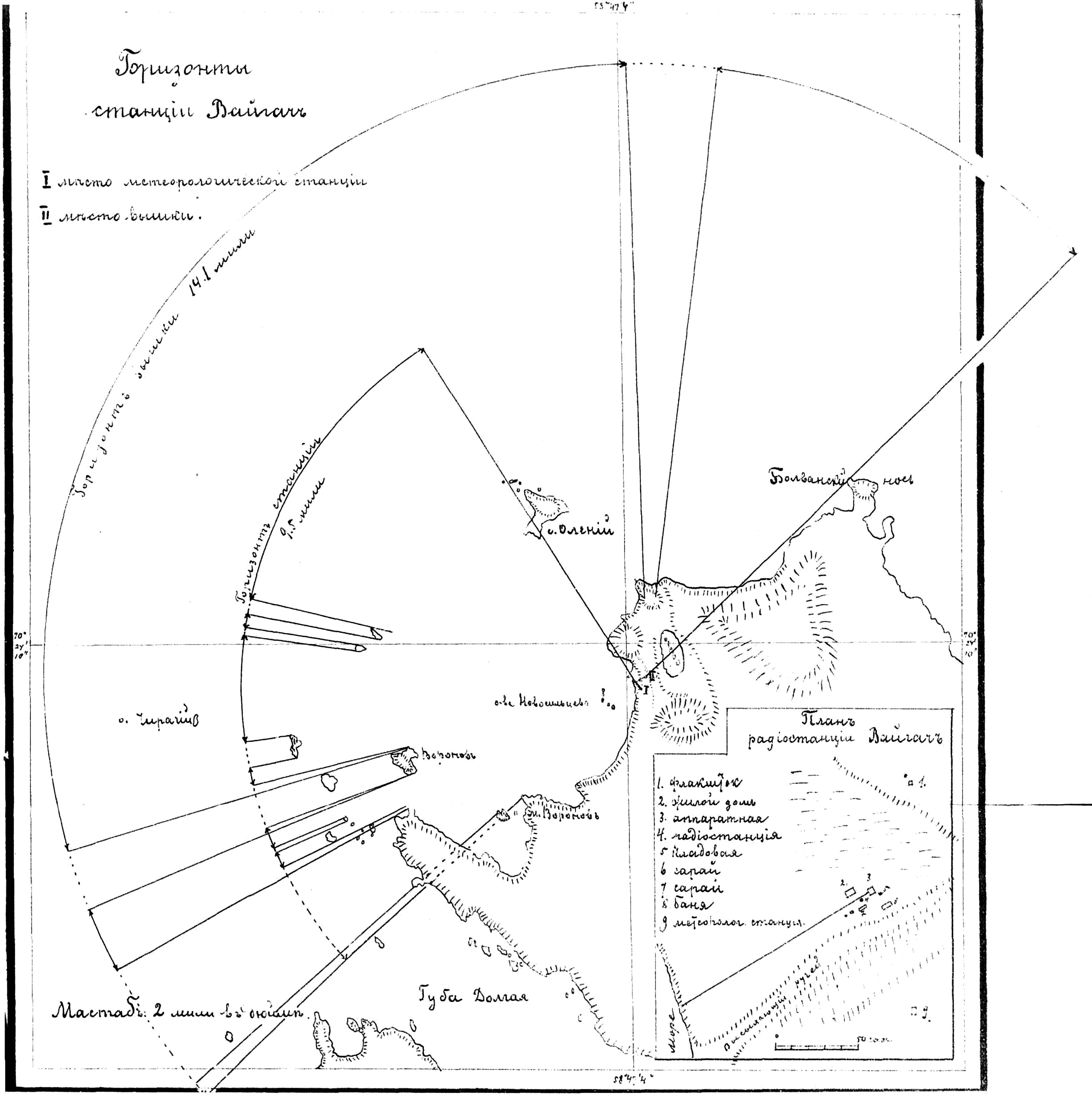 Станция расположена в широкой бухте, прикрытой c моря островами, и горизонт моря, открывающийся с земли (с возвышенной части берега, где стоит метеорологическая станция), как это видно по чертежу 3, не велик, всего около 80°, при радиусе в 9. 5 миль, причем значительная часть горизонта прикрыта: с севера мысом о. Вайгач, с юго-запада м. Воронов, оставшийся промежуток по горизонту наполовину закрыт многочисленными островами.