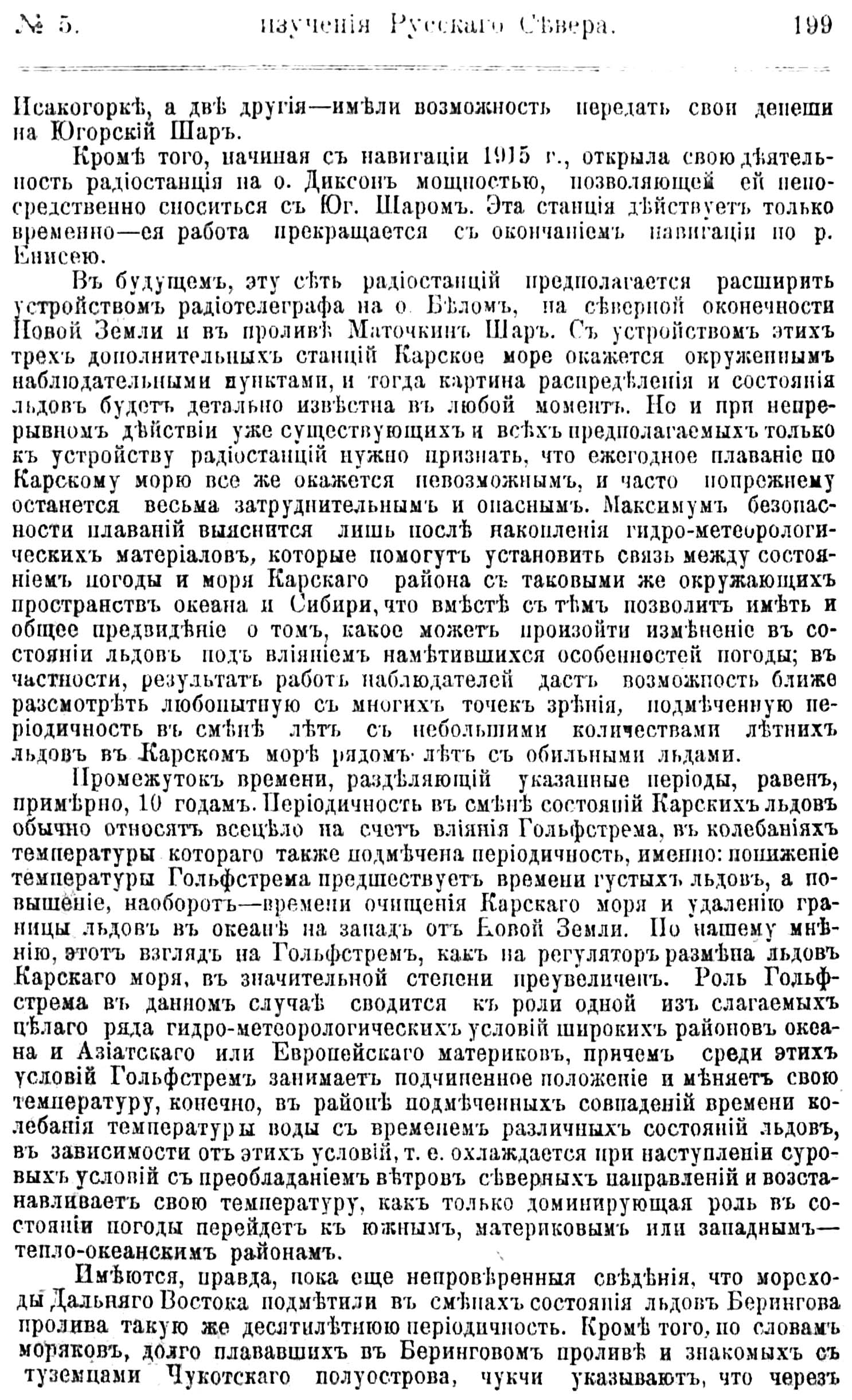 Промежуток времени, разделяющий указанные периоды, равен, примерно, 10 годам. Периодичность в смене состояний Карских льдов обычно относят всецело на счет влияния Гольфстрема, в колебаниях температуры которого также подмечена периодичность, именно: понижение температуры Гольфстрема предшествует времени густых льдов, а повышение, наоборот — времени очищения Карского моря и удалению границы льдов в океан на запад от Новой Земли. По нашему мнению, этот взгляд на Гольфстрем, как на регулятор размена льдов Карского моря, в значительной степени преувеличен. Роль Гольфстрема в данном случае сводится к роли одной из слагаемых целого ряда гидро-метеорологических условий широких районов океана и Азиатского или Европейского материков, причём среди этих условий Гольфстрем занимает подчиненное положение и меняет свою температуру, конечно, в районе подмеченных совпадений времени колебания температуры воды с временем различных состояний льдов, в зависимости от этих условий, т. е. охлаждается при наступлении суровых условий с преобладанием ветров северных направлений и восстанавливает свою температуру, как только доминирующая роль в состоянии погоды перейдёт к южным, материковым или западным — тепло-океанским районам.