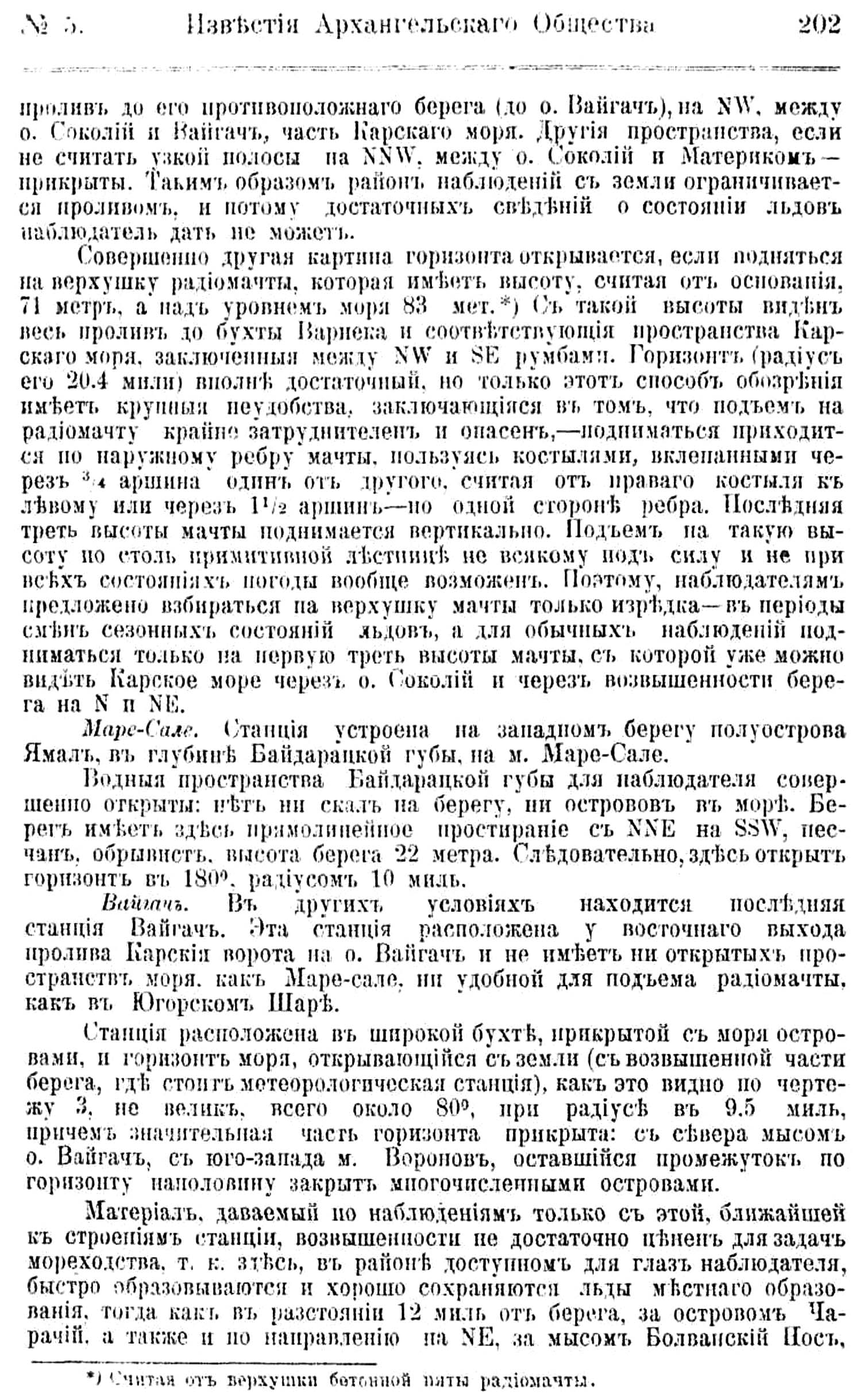 Совершенно другая картина горизонта открывается, если подняться на верхушку радиомачты, которая имеет высоту, считая от основания, 71 метр, а над уровнем моря 83 мет. *) С такой высоты виден весь пролив до бухты Варнека и соответствующие пространства Карского моря, заключенные между NW и SE румбами. Горизонт (радиус его 20. 4 мили) внолне достаточный, но только этот способ обозрения имеетъ крупные неудобства, заключающияся в том, что подъем на радиомачту крайне затруднителен и опасен, — подниматься приходится по наружному ребру мачты, пользуясь костылями, вклепанными через 3/4 аршина один от другого, считая от правого костыля к левому или через 1 1/2 аршин — по одной стороне ребра. Последняя треть высоты мачты поднимается вертикально. Подъем на такую высоту по столь примитивной лестнице не всякому под силу и не при всех состояниях погоды вообще возможен. Поэтому, наблюдателям предложено взбираться на верхушку мачты только изредка — в периоды смен сезонных состояний льдов, а для обычных наблюдений подниматься только на первую треть высоты мачты, с которой уже можно видеть Карское море через о. Соколий и через возвышенности берега на N и NE.