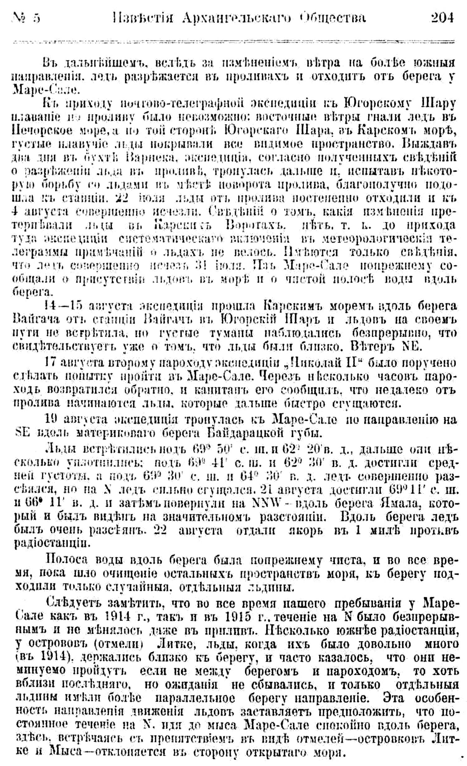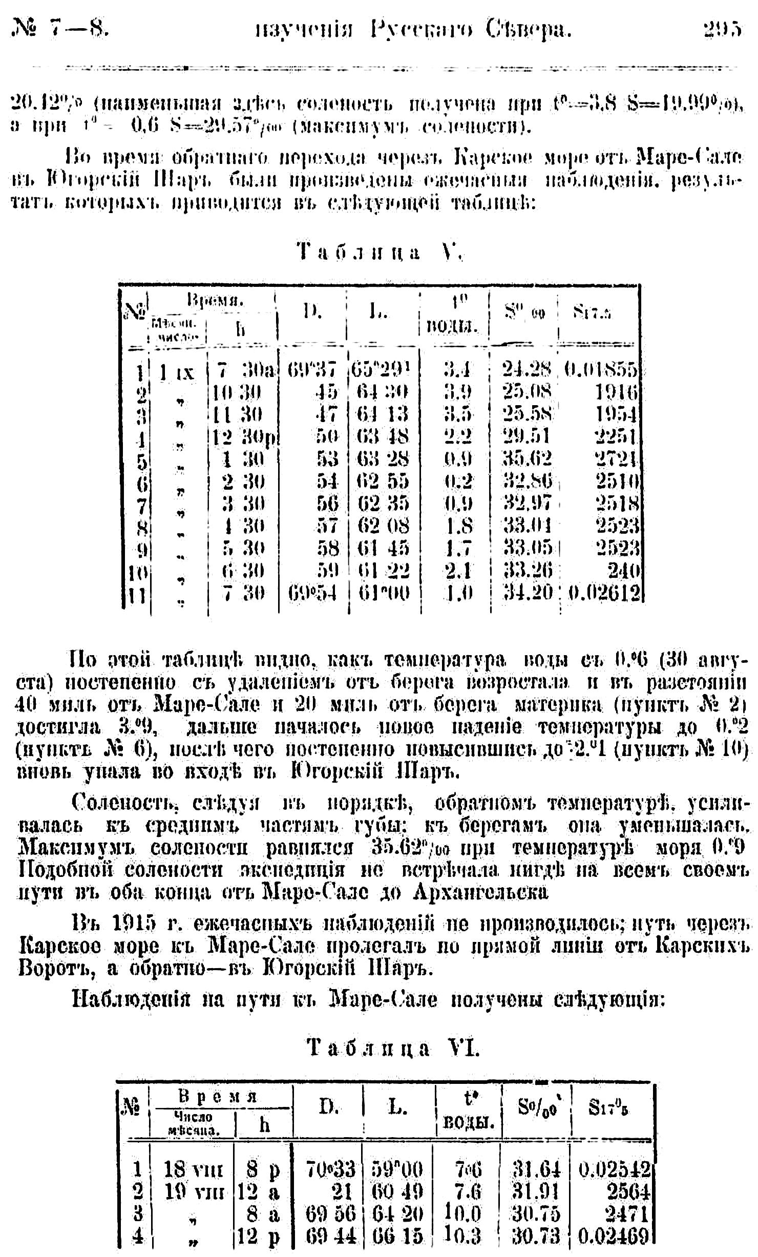 Следуст заметить, что во все время нашего пребывания у Маре-Сале как в 1914 г., так и в 1915 г., течение на N было беспрерывным и не менялось даже в прилив. Несколько южнее радиостанции, у островов (отмели) Литке, льды, когда их было довольно много (в 1914), держались близко к берегу, и часто казалось, что они неминуемо пройдут если не между берегом и пароходом, то хоть вблизи последнего, но ожидания не сбывались, и только отдельные льдины имели более параллельное берегу направление. Эта особенность направления движения льдов заставляет предположить, что постоянное течение на N, идя до мыса Маре-Сале спокойно вдоль берега, здесь, встречаясь с препятствием в виде отмелей — островков Литке и Мыса — отклоняется в сторону открытого моря.