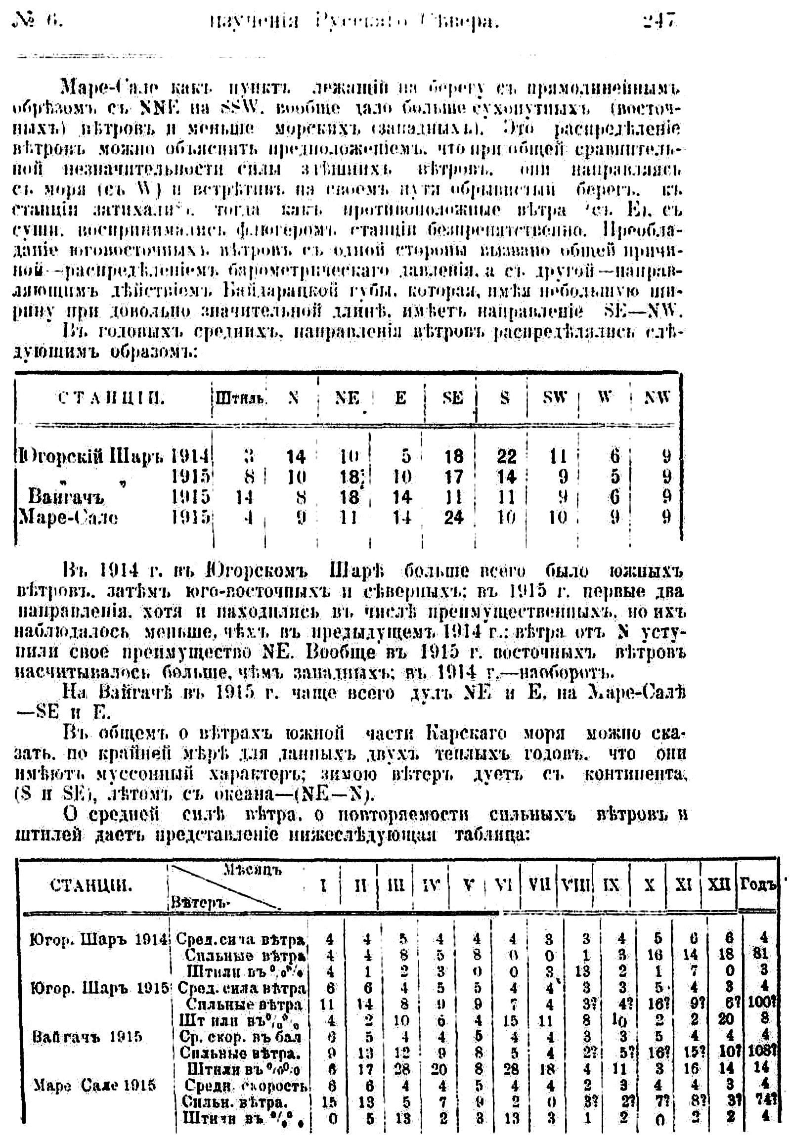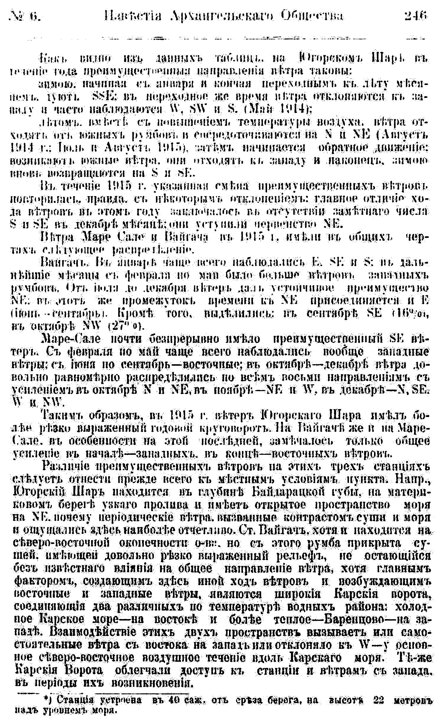 Метеорологические пункты при радиостанциях устроены еще в 1912 г. Д. Д. Рудневым, ездившим сюда вместе с почтово-телеграфной экспедицией по поручению Отдела Торговых Портов. Д. Д. Руднев установил метеорологические приборы в Югорском Шаре и на о. Вайгач. Но наблюдения здесь начались позже: в Югорском Шаре с сентября 1913 г., а на Вайгаче с августа 1914 г. На Маре-сале приборы установлены в сентябре 1914 г. командированными центральной гидрометеорологической станцией (в Архангельске ) В. А. Березкиным и автором настоящей статьи.