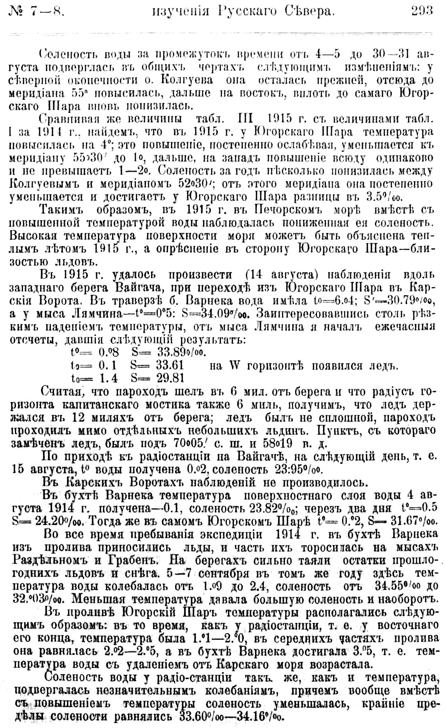 К настоящему времени, т. е. к началу 1916 г., наблюдатели Карского моря имели возможность проследить целиком две навигации, начиная от вскрытия проливов в 1914 г. до замерзания их на зиму 1915—16 года.