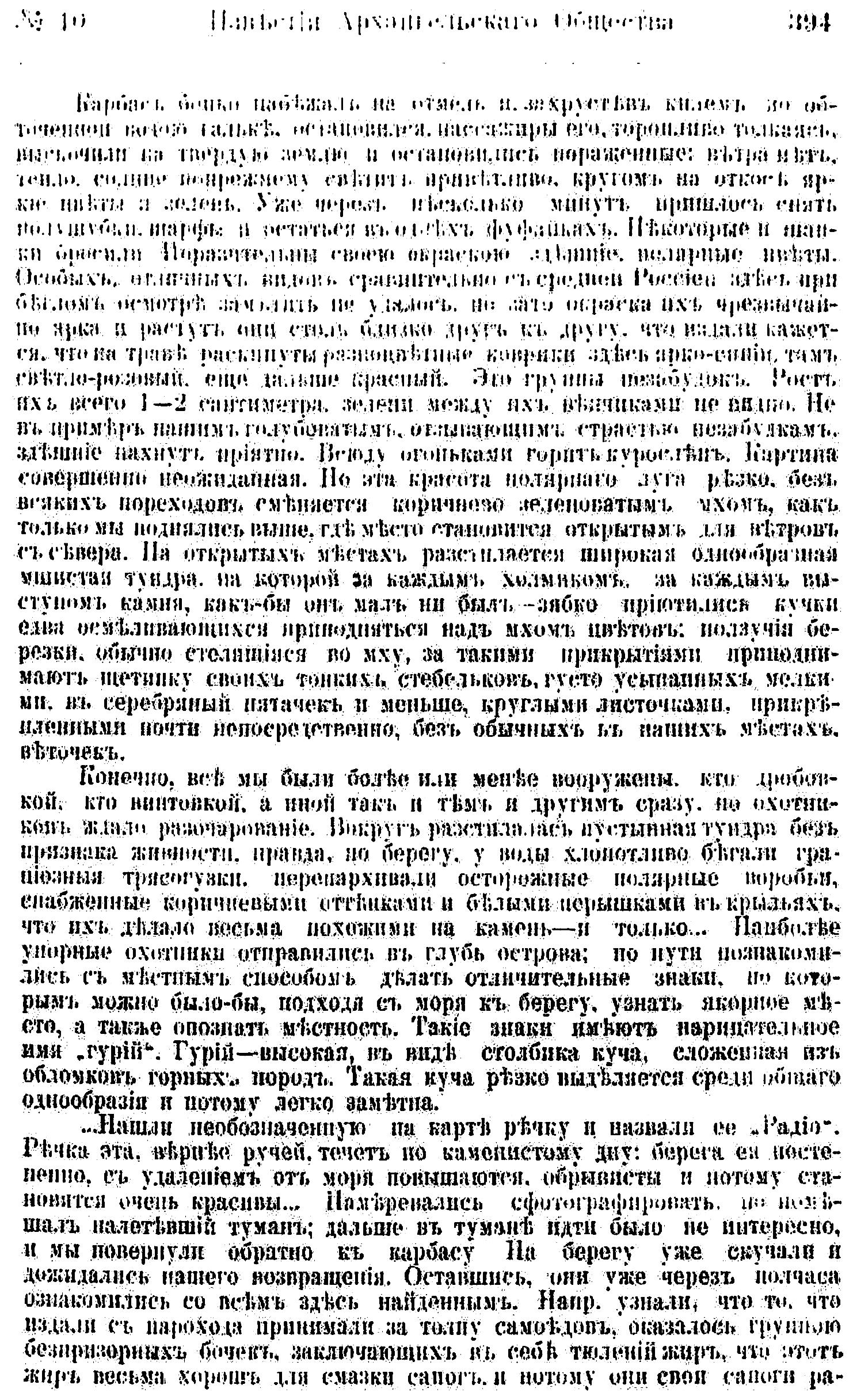 Много интереснее береговая полоса тундры. Берег прилива сплошь скалистый, скалы отвесно опускаются к морю, высота их чаще саженей 3—4, иногда меньше, иногда же, где холм подошел к морю, высота обрыва до 20 и 30 с. Береговая черта, если не считать мелких, но беспрерывных, полукруглых бухточек -- ровная. Бухточки образованы небольшими выступами скал. Выступы эти обнажены и обточены ветрами и волнами, и в глубине бухточек лежать более или менее значительные в соответствии с величиной бухты — валы гальки и разлагающейся морской капусты: можно найти здесь и пласты тающего снега. Морская капуста местами, особенно после шторма, л ежить валом до сажени и больше высоты.