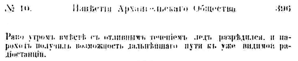 Льды встретились под 69°50' с. ш. и 62° 20' в. д., дальше они несколько уплотнились: под 69° 41' с. ш. и 62° 30' в. д. достигли средней густота, а под 69° 30' с. ш. и 64° 30' в. д. лед совершенно рассеялся, но на N лед сильно сгущался. 21 августа достигли 69°11' с. ш. и 66° 11' в. д. и затем повернули на NNW - вдоль берега Ямала, который и был виден на значительном расстоянии. Вдоль берега лед был очень рассеян. 22 августа отдали якорь в 1 миле против радиостанции.