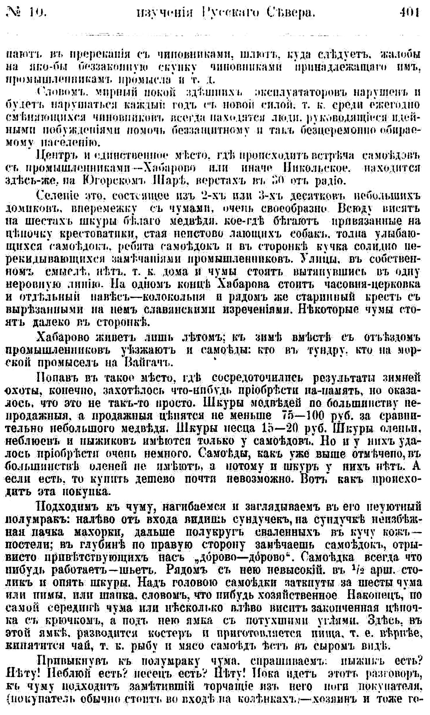 Селение это, состоящее из 2-х или З-х десятков небольших домиков, вперемежку с чумами, очень своеобразно. Всюду висят на шестах шкуры белого медведя, кое-где бегают привязанные на цепочку крестоватики, стая неистово лающих собак, толпа улыбающихся самоедок, ребята самоедок и в сторонке кучка солидно перекидывающихся замечаниями промышленников. Улицы, в собственном смысле, нет, т. к. дома и чумы стоять вытянувшись в одну неровную линию. На одном конце Хабарова стоит часовня-церковка и отдельный навес — колокольня и рядом же старинный крест с вырезанными на нем славянскими изречениями. Некоторые чумы стоять далеко в сторонке.
