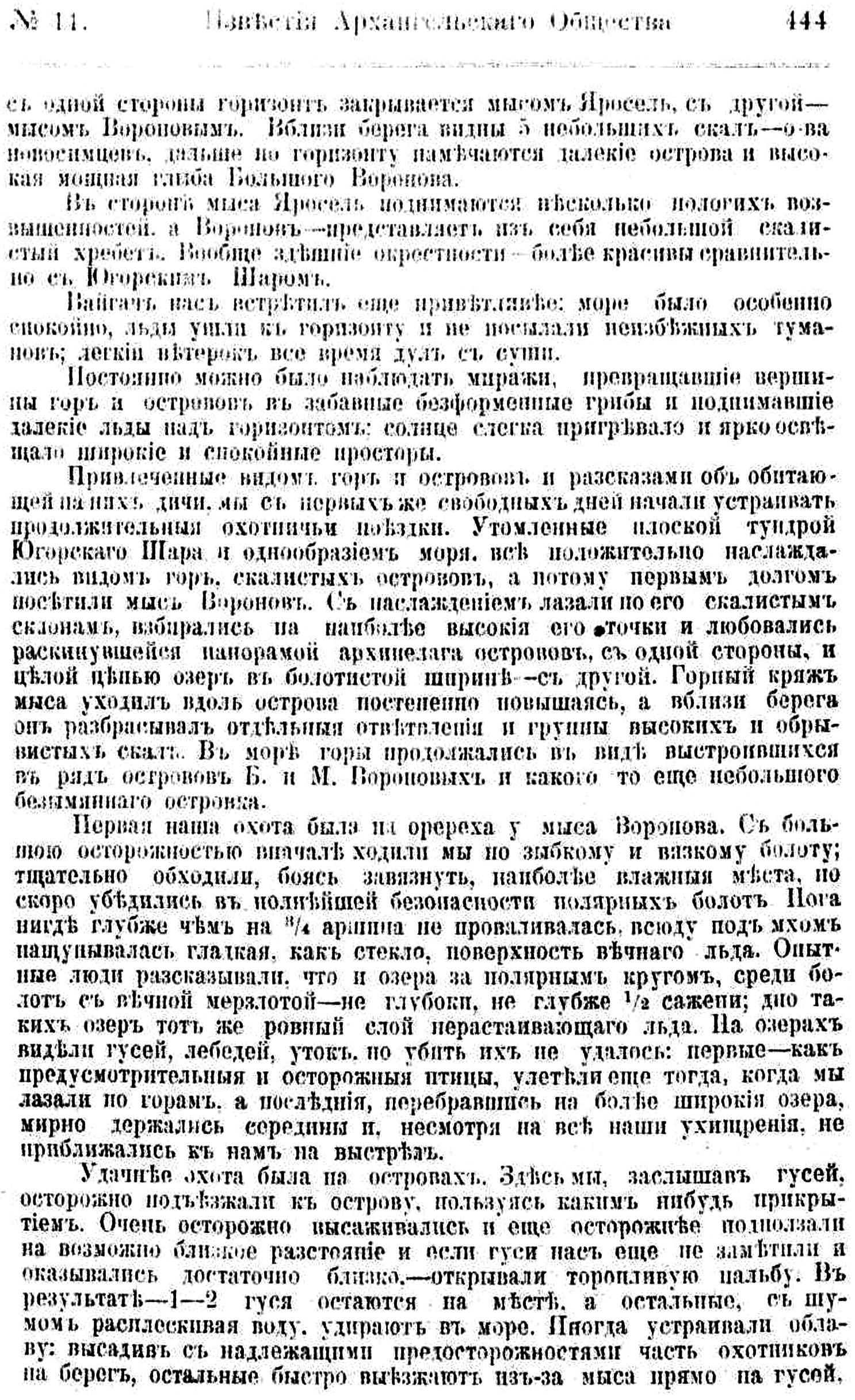 Первая наша охота была на оререха у мыса Воронова. С большою осторожностью вначале ходили мы по зыбкому и вязкому болоту; тщательно обходили, боясь завязнуть, наиболее влажные места, но скоро убедились в полнейшей безопасности полярных болот. Нога нигде глубже чем на 3/4 аршина не проваливалась, всюду под мхом нащупывалась гладкая, как стекло, поверхность вечного льда. Опытные люди рассказывали, что и озера за полярным кругом, среди болот с вечной мерзлотой — не глубоки, не глубже 1/2 сажени; дно таких озер тот же ровный слой нерастаивающего льда. На озерах видели гусей, лебедей, уток, но убить их не удалось: первые — как предусмотрительные и осторожные птицы, улетели еще тогда, когда мы лазали но горам, а последние, перебравшись на более широкие озера, мирно держались середины и, несмотря на все наши ухищрения, не приближались к нам на выстрел.