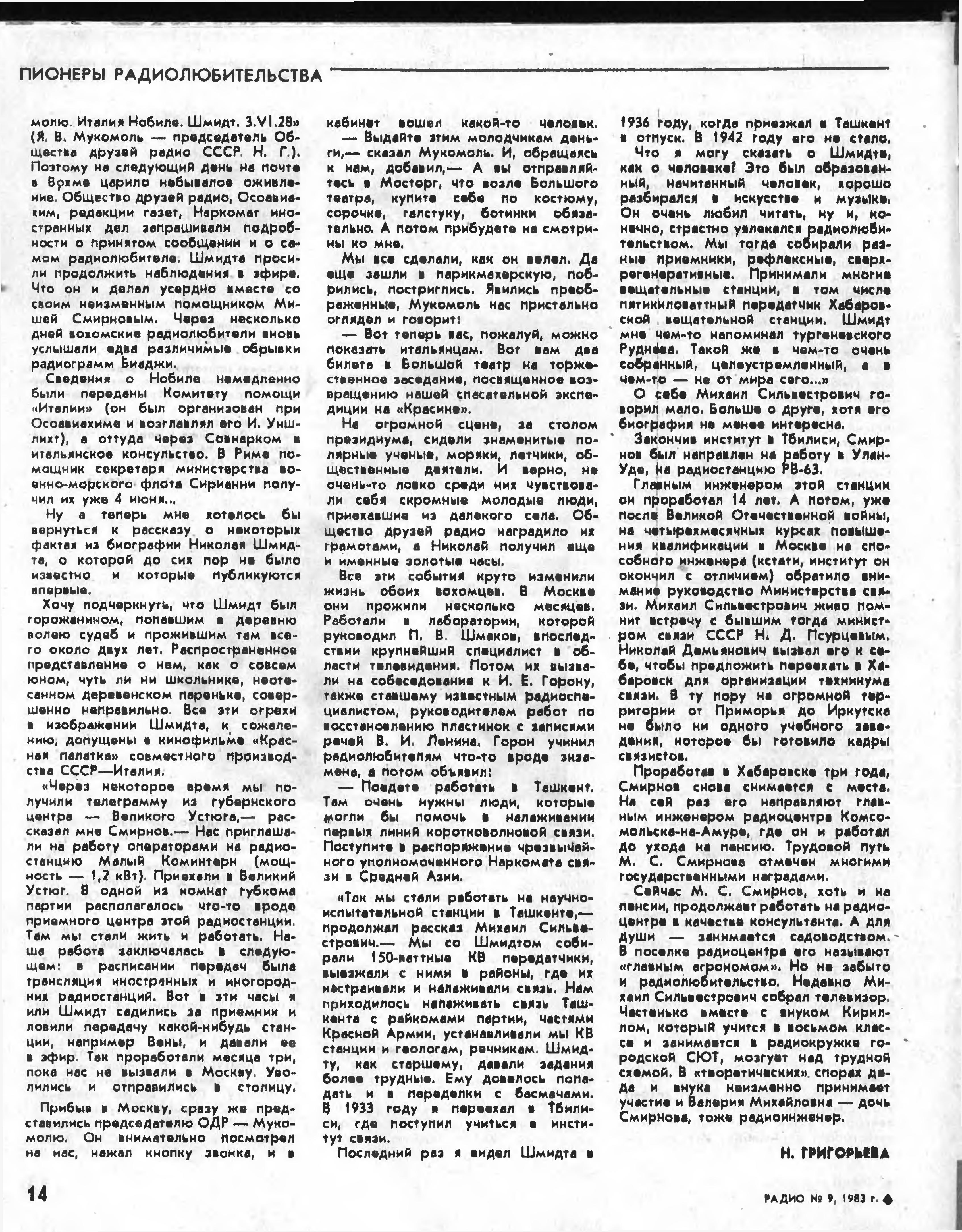 дилось налаживать связь Ташкента с райкомами партии, частями Красной Армии, устанавливали мы рации и геологам, речникам. Шмидту, как старшему, давались задания более трудные. Ему случалось попадать в переделки с басмачами. В Ташкенте мы жили сначала в маленькой глинобитной пристройке во дворе Управления связи, а потом нам выделили комнату в одноэтажном доме в центре города. В 1933 году я переехал в Тбилиси, где поступил учиться в Институт связи. Последний раз я видел Шмидта в 1936 году.
