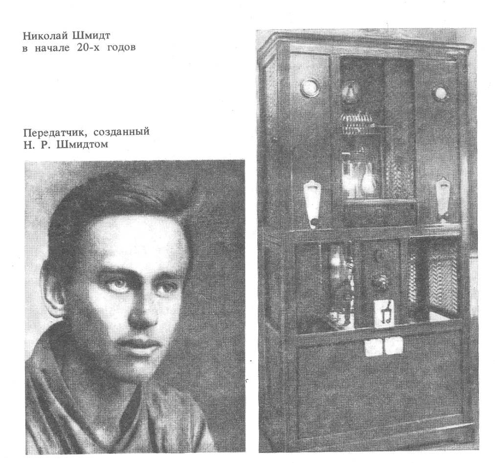 Николай Шмидт не мог не заинтересоваться короткими волнами, мечтал сделать передатчик. Ну, а что касается приемников, то вот что об этом рассказывает он сам в статье «Огонька»: «За период с 1924 г. мной было сконструировано множество различных приемников, главным образом с двухсеточными лампами низких анодных напряжений (негде было достать высоковольтные анодные батареи). Последний вариант сконструированного мной приемника представлял собой комбинацию немецкой передвижки для КВ и рефлекса. (Иначе говоря, приемник был собран по усовершенствованной Шмидтом схеме, вероятно найденной в немецком радиотехническом журнале. — Н. Г.) На этом одноламповом приемнике мной и был принят «805» с «Италии»».