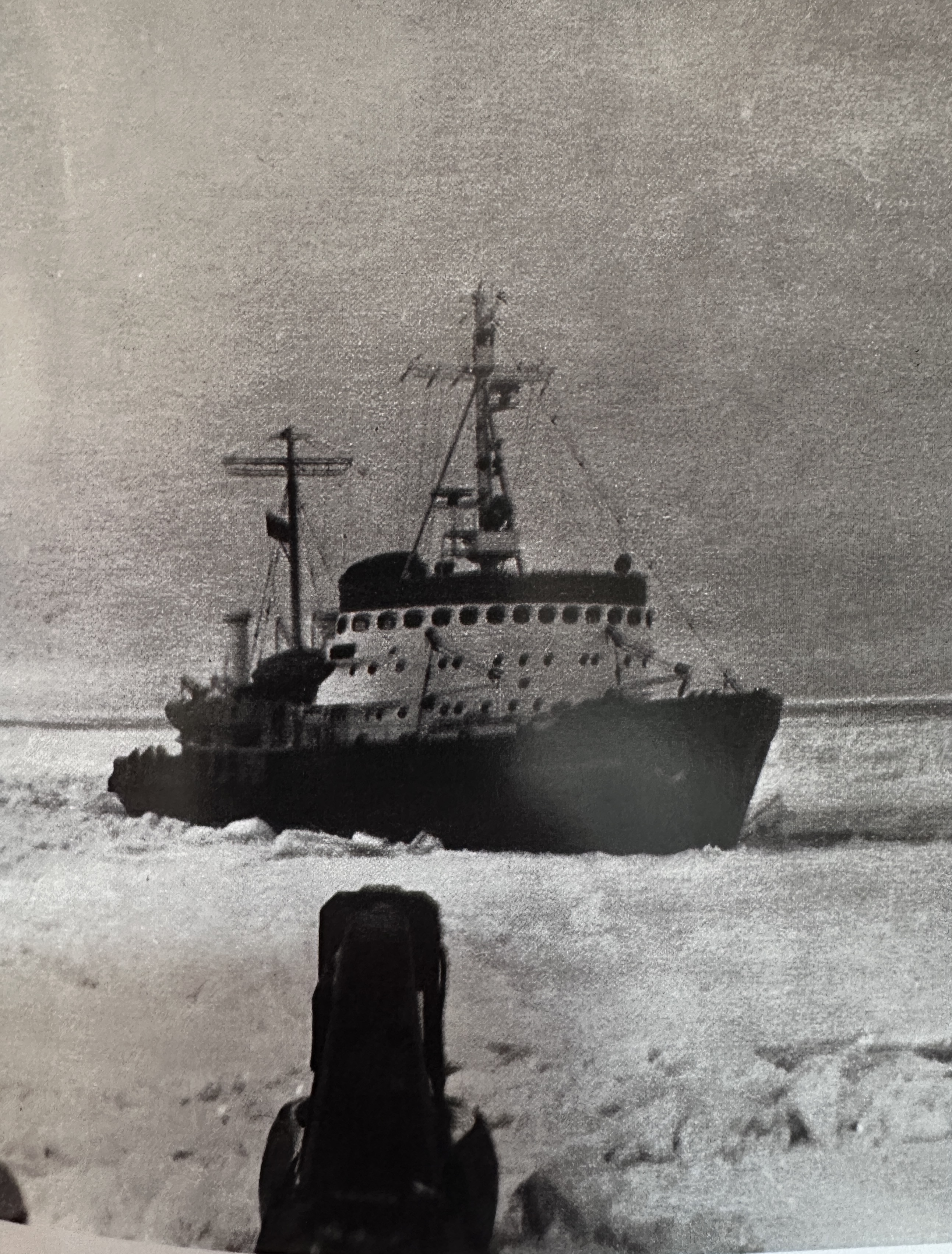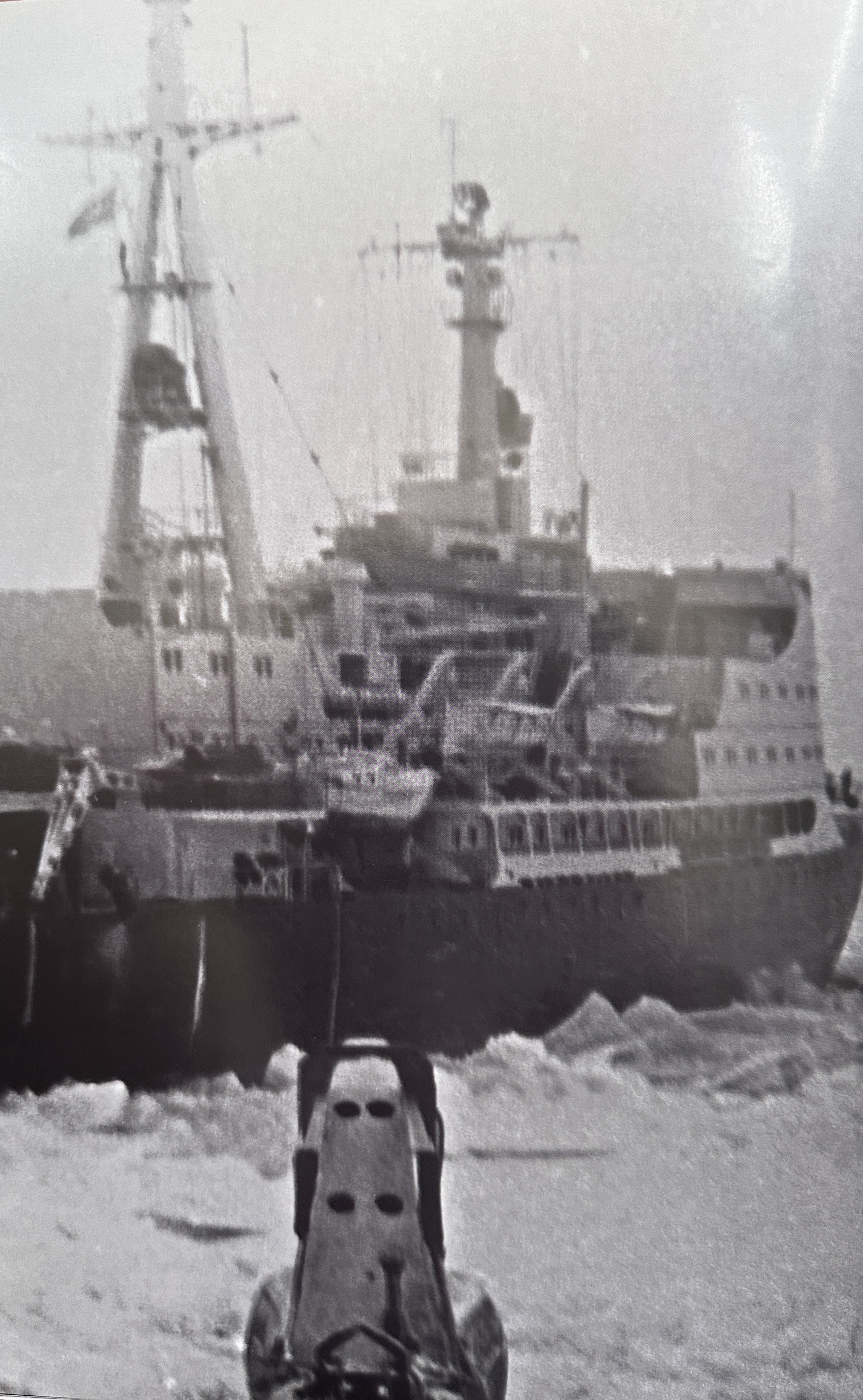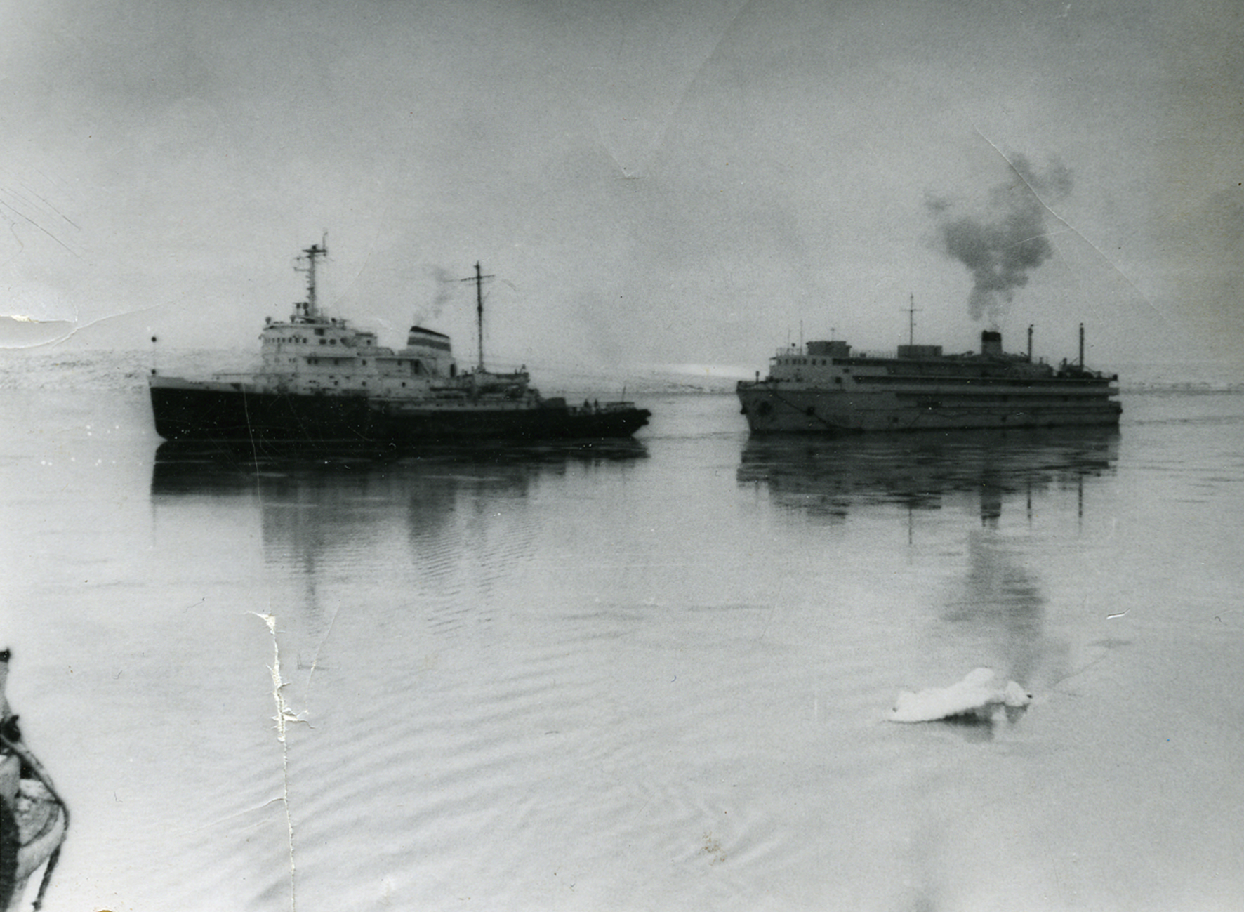 Практически параллельно с ЭОН-73 состоялась и очередная Экспедиция спецмопроводок МРФ СССР(до 100 судов), чью ледовую проводку по СМП с воздуха также обеспечивали самолёты УПА ГВФ, а на трассе - ледоколы. На снимке в центре - один из участников этой экспедиции (1963) - речной буксир-толкач «ОТА-800» Пр.758АД. Фото из архива Д.В.Лёзина - в то время студента-практиканта третьего курса Новосибирского института инженеров водного транспорта, прикомандированного в его экипаж в качестве моториста.