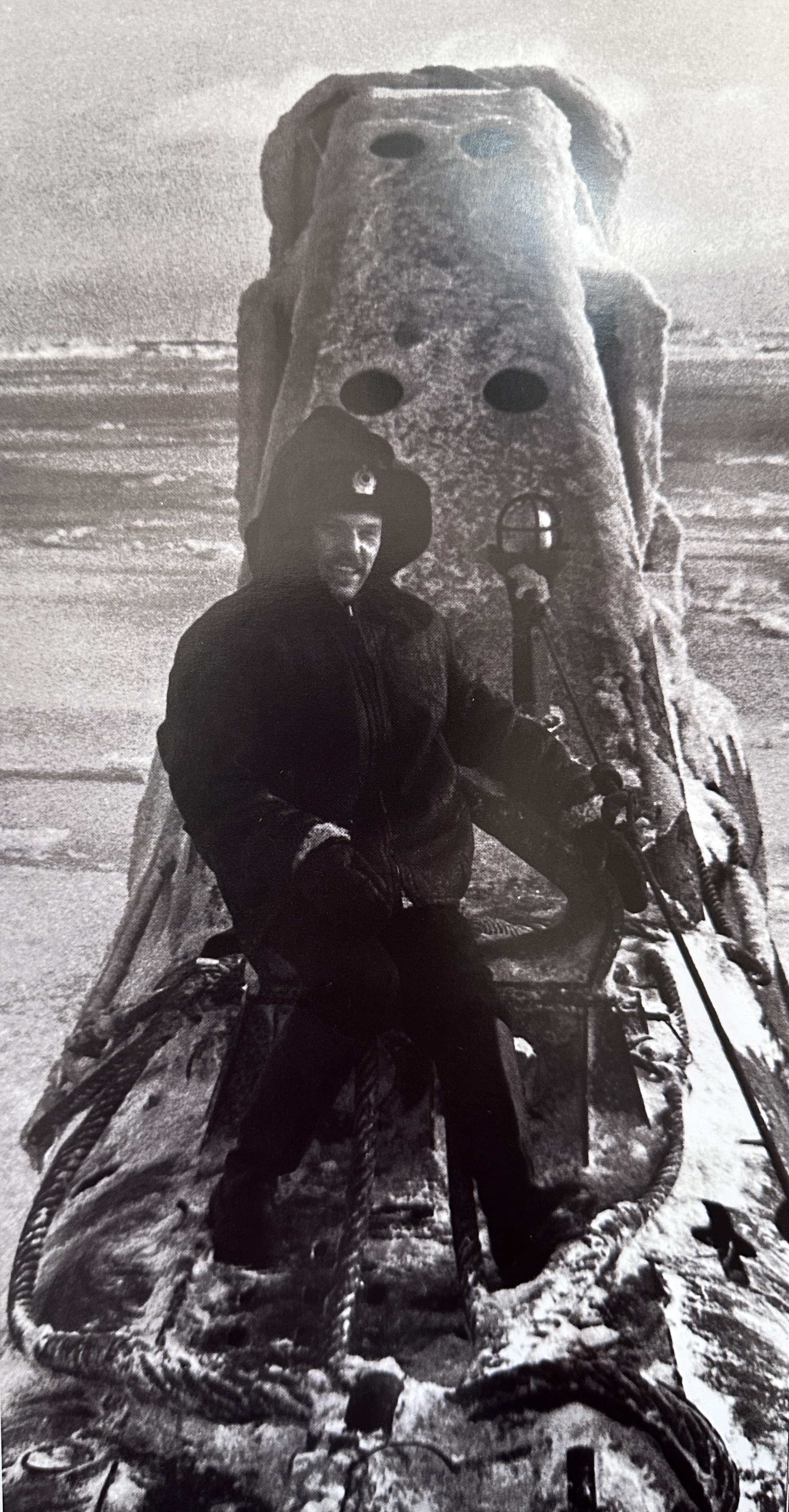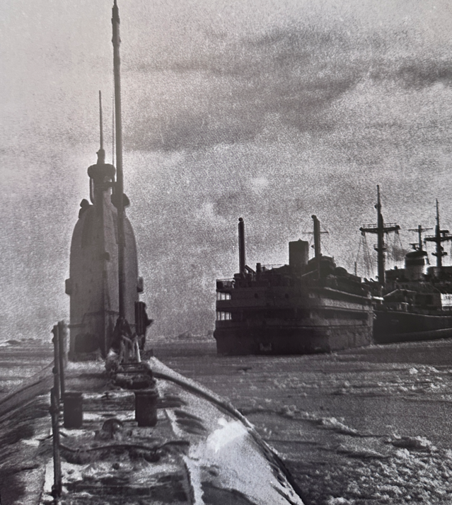 На снимках: "Б-8" следует по СМП за ледоколом с ПКЗ; НШ ЭОН-73 капитан 1 ранга А.И.Матвеев (слева) с капитаном-лоцманом Б.Е.Ушаковым на палубе ледокола "Вьюга". СМП, 1963 г.; На палубе носовой части "Б-8" - командир штурманской боевой части капитан-лейтенант И.Г.Чефонов (будущий капитан 1 ранга, командир РПКСН «К-455» Пр.667БДР 25-й дипл 2-й флотилии ПЛ ТОФ). СМП, 1963 г. Фото из его личного архива.