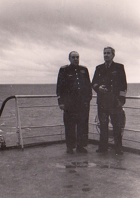На снимке: офицеры "Чумикана" на юте корабля на фоне АЛК "Ленин", СМП, 1963 г.: ст.л-т Ю.В.Колошин, ст.л-т Э.С.Булдовский, капитан-л-т Ю.Орловский, ст.л-т А.Евстигнеев.