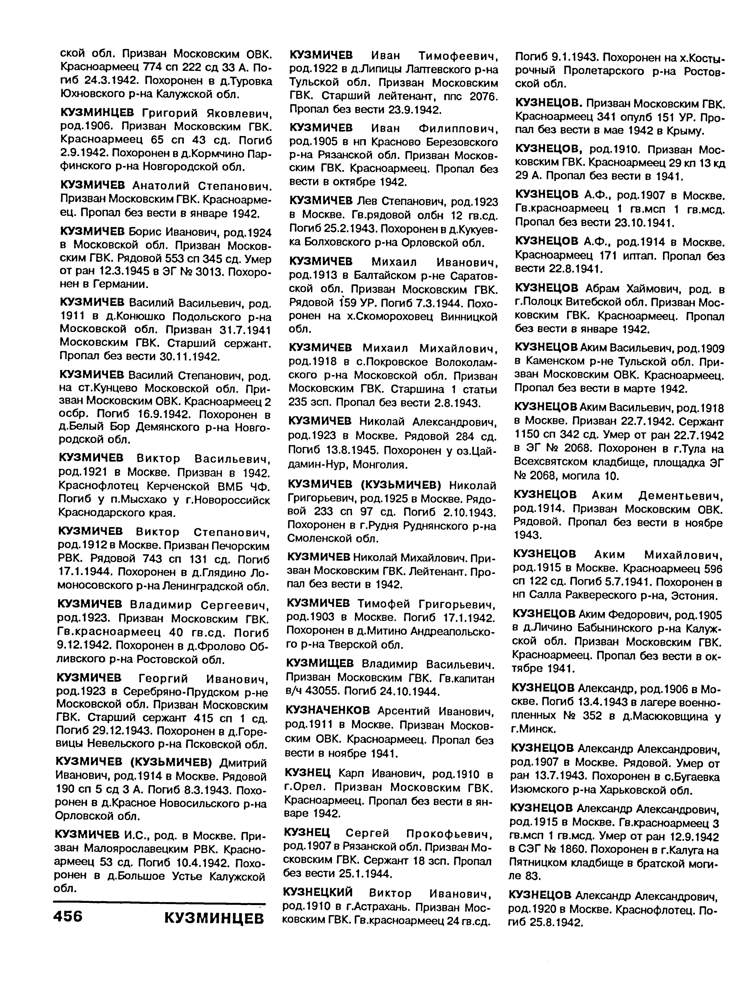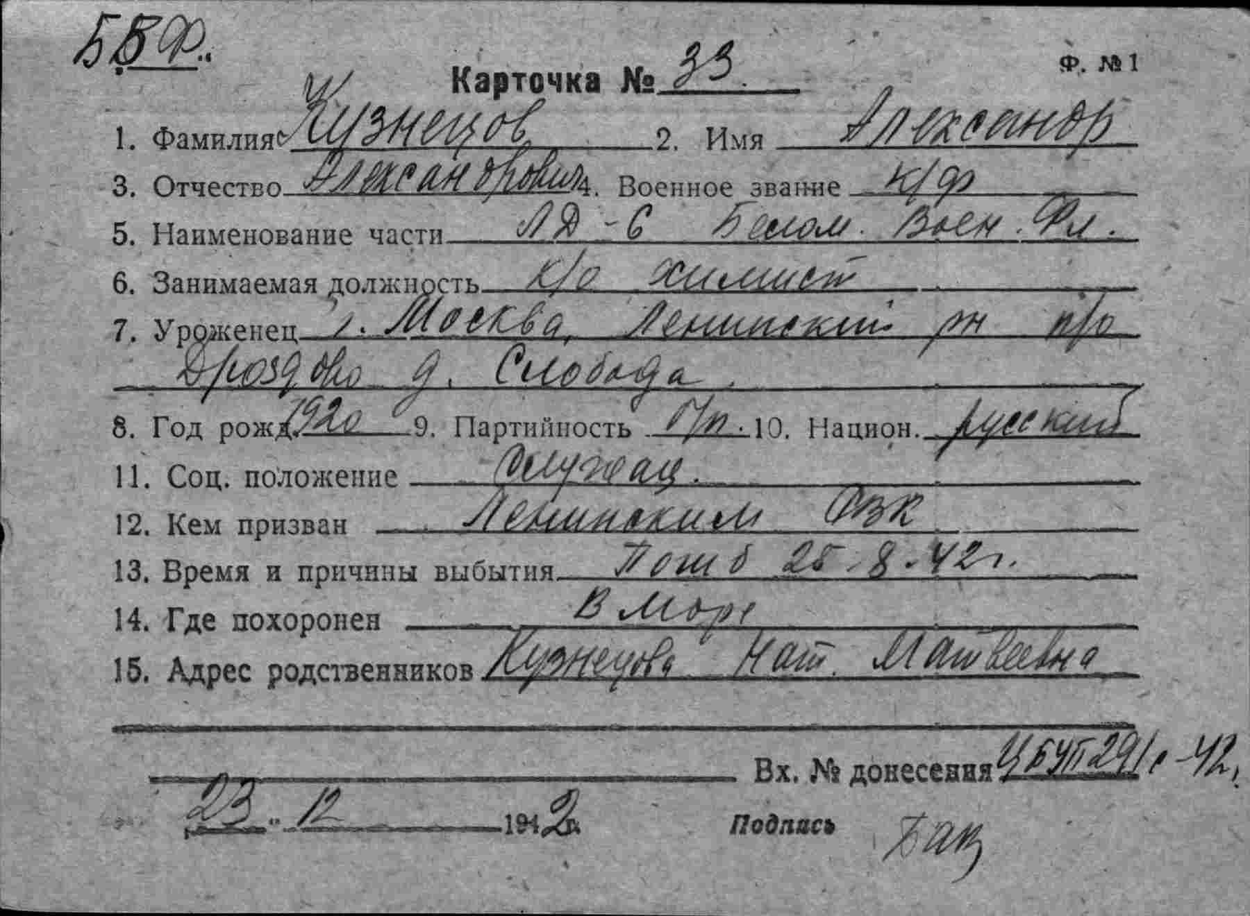 Дата и место призыва __.__.1941 Ленинский РВК, Московская обл., г. Москва, Ленинский р-н