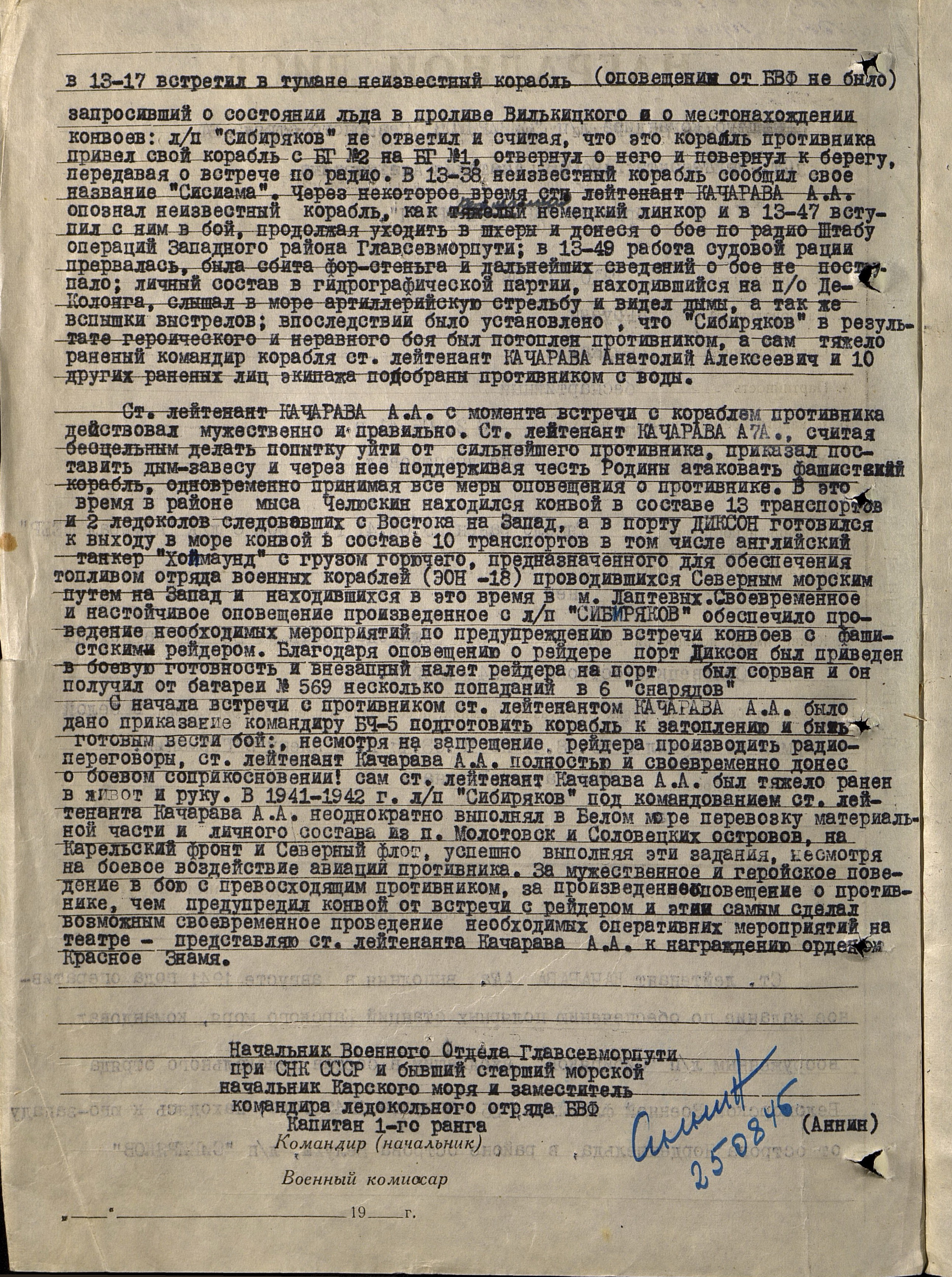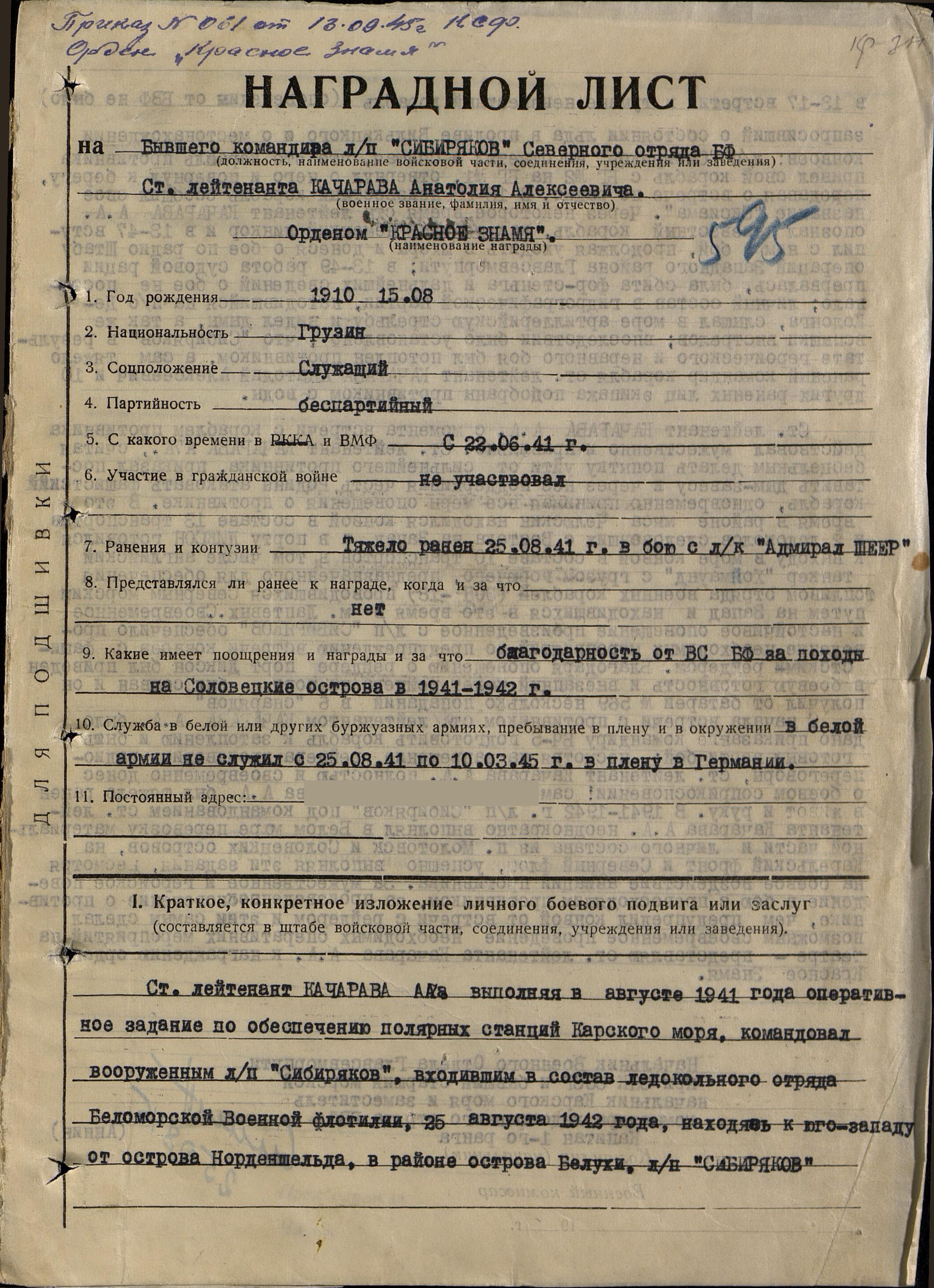 …В 1950 году мне пришлось проходить практику на ледокольном пароходе «Леваневский», названном в честь отважного полярного летчика. Капитаном был А.А. Качарава. В Великую Отечественную войну он командовал ледокольным пароходом «Сибиряков». В ходе неравного боя с фашистским крейсером «Адмирал Шеер» недалеко от острова Белуха в Карском море пароход был потоплен, но радист успел сообщить о грозящей опасности на остров Диксон. Многие из команды погибли. Раненный капитан был подобран фашистами из воды и пленен. Только одному из уцелевших удалось избежать плена – Павлу Вавилову, который сумел доплыть до острова Белуха и около месяца питался отрубями (мешок прибило волной к берегу), пока не пришла помощь. А.А. Качараве (?! – С.Ш.) в последствии было присвоено звание Героя Социалистического Труда, мы с ним вместе работали на ледоколе «Ермак». Каждый раз, когда «Леваневский» проходил мимо острова Белуха, капитан А.А. Качарава и три сибиряковца из рядового состава одевались в парадную форму, поднимались на мостик, выстраивались в шеренгу, отдавая честь погибшему кораблю и погибшим товарищам. Басовитый троекратный продолжительный гудок возвещал о том, что уцелевшие товарищи живы и пришли вспомнить о своих боевых товарищах.