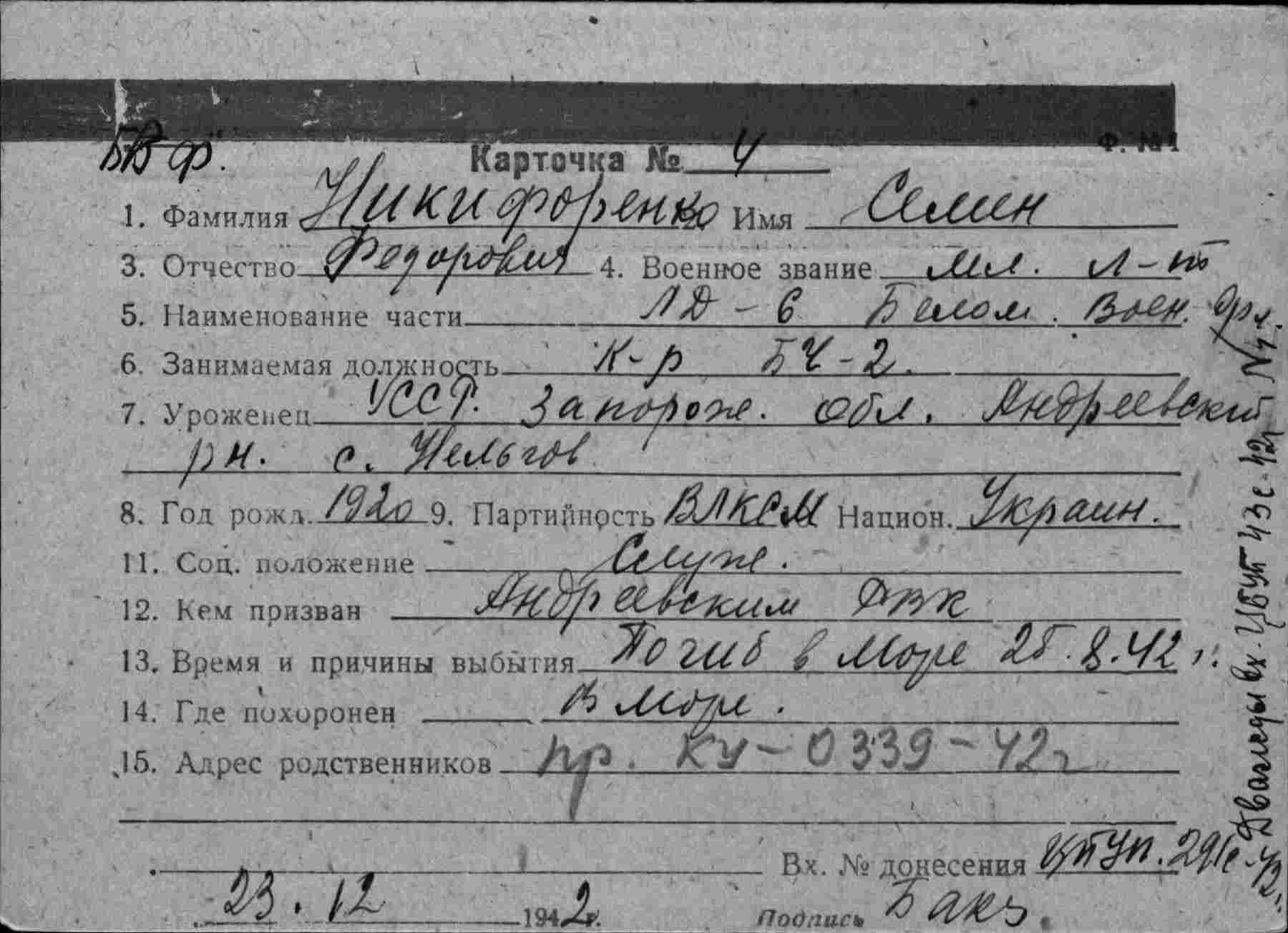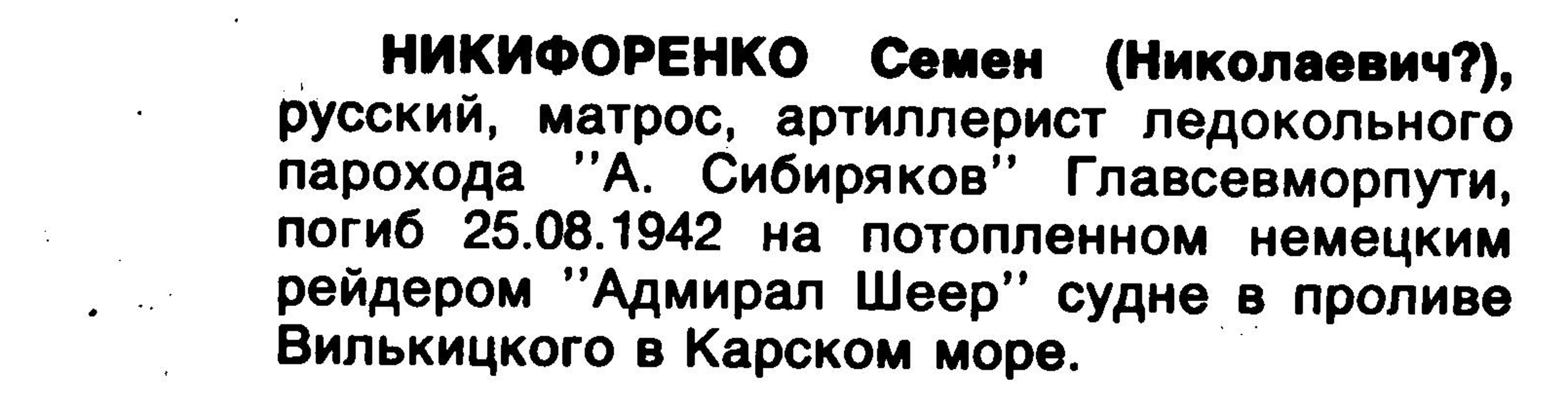 3 августа 1942 года С. Никифоренко присвоили воинское звание лейтенанта, а через 22 дня он погиб вместе с кораблём…»