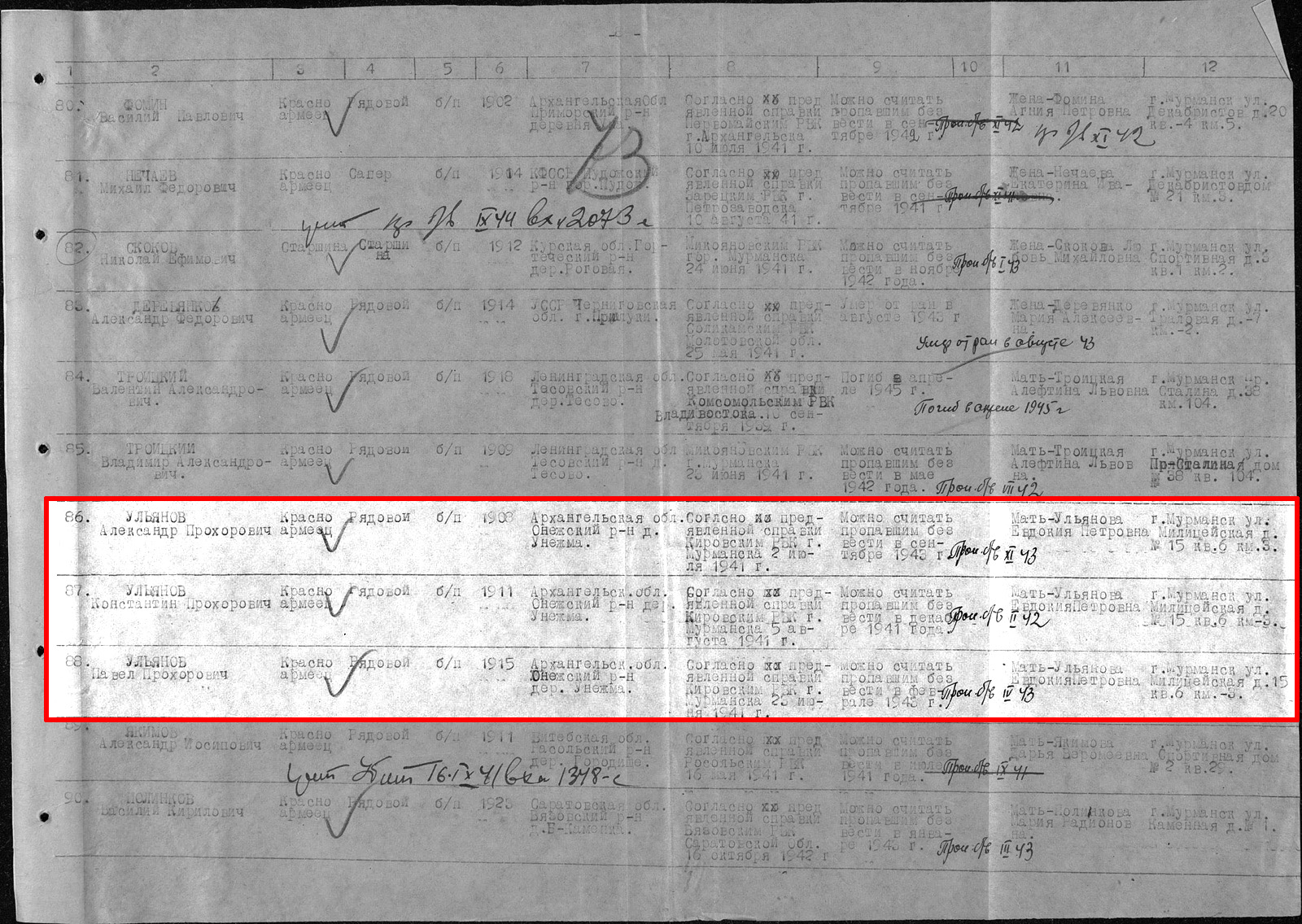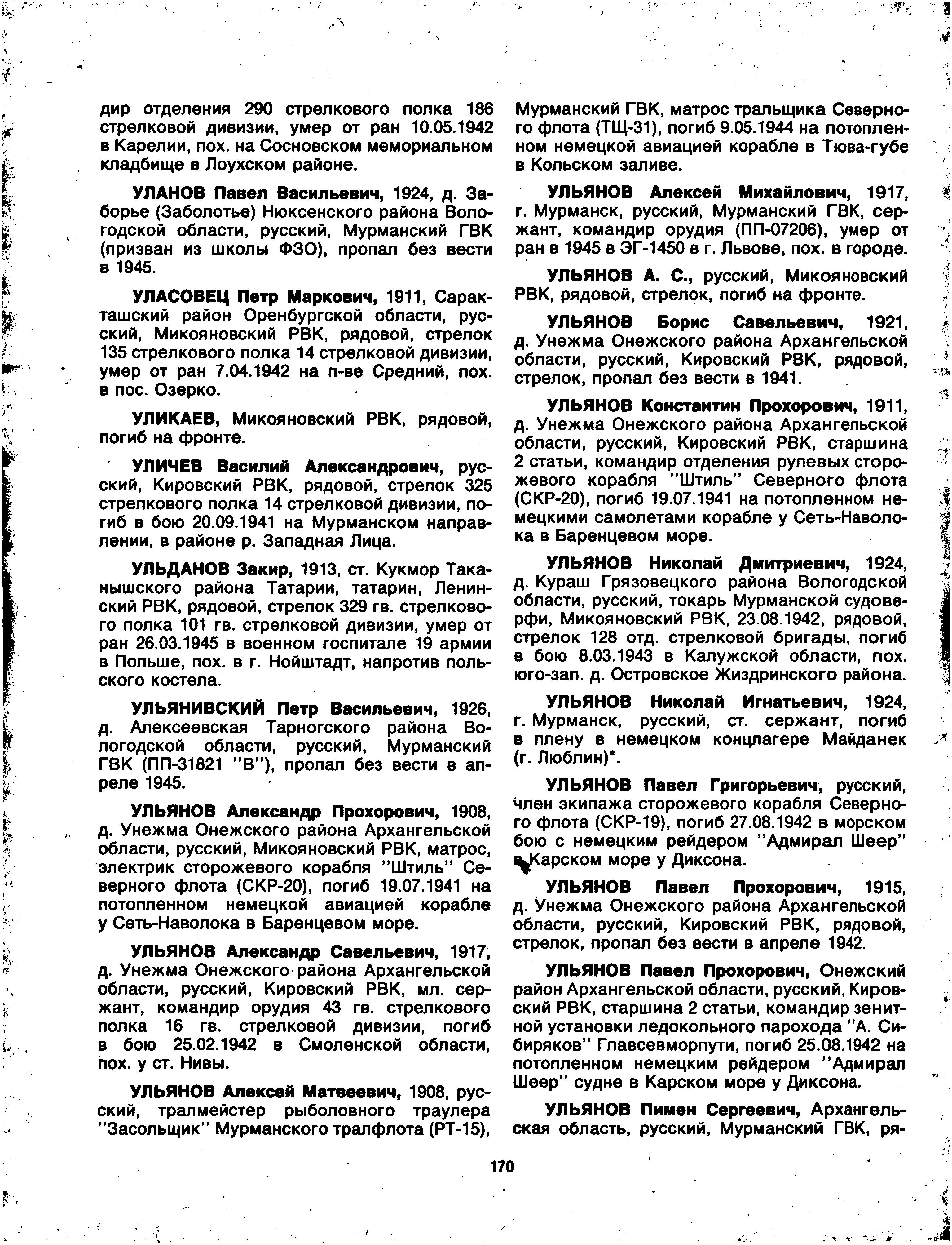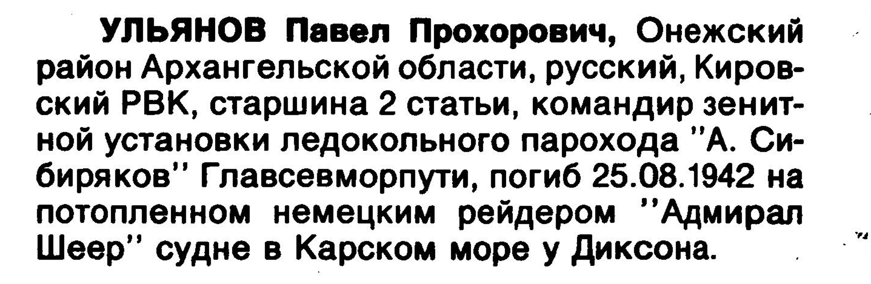 Странный вопрос. Как-то он меня в тупик поставил. Я сейчас не могу точно сказать, что книга Памяти Мурманской области вводит в заблуждение читателей. Да, скорей всего это так. Но откуда составители книги памяти взяли эту информацию? Может есть основания для включения в книгу? Если была путаница с количеством погибших и находившихся на л/п "А. Сибиряков", кто может дать 100% гарантию, что не было на судне старшины 2 статьи (а не первой), командира зенитной установки (а не из из отделения рулевых) Ульянова Павла Прохоровича (И.Г. Шнейдер пишет про своего друга Ульянова Павла Григорьевича, вряд ли он перепутает отчество своего друга)? В книге Н.А. Елагина упоминается только Ульянов Павел Григорьевич (а не Прохорович). В статье Константина Степина, контр-адмирала, бывшего командир БЧ-2 СКР-19 («Дежнёв») "Арктика, август 1942 года" из этой книги пишется о погибшем дежневце Павле Григорьевиче Ульянове. Может Павел Григорьевич Ульянов и Павел Прохорович Ульянов - два разных человека? Я всего лишь хочу установить истину.