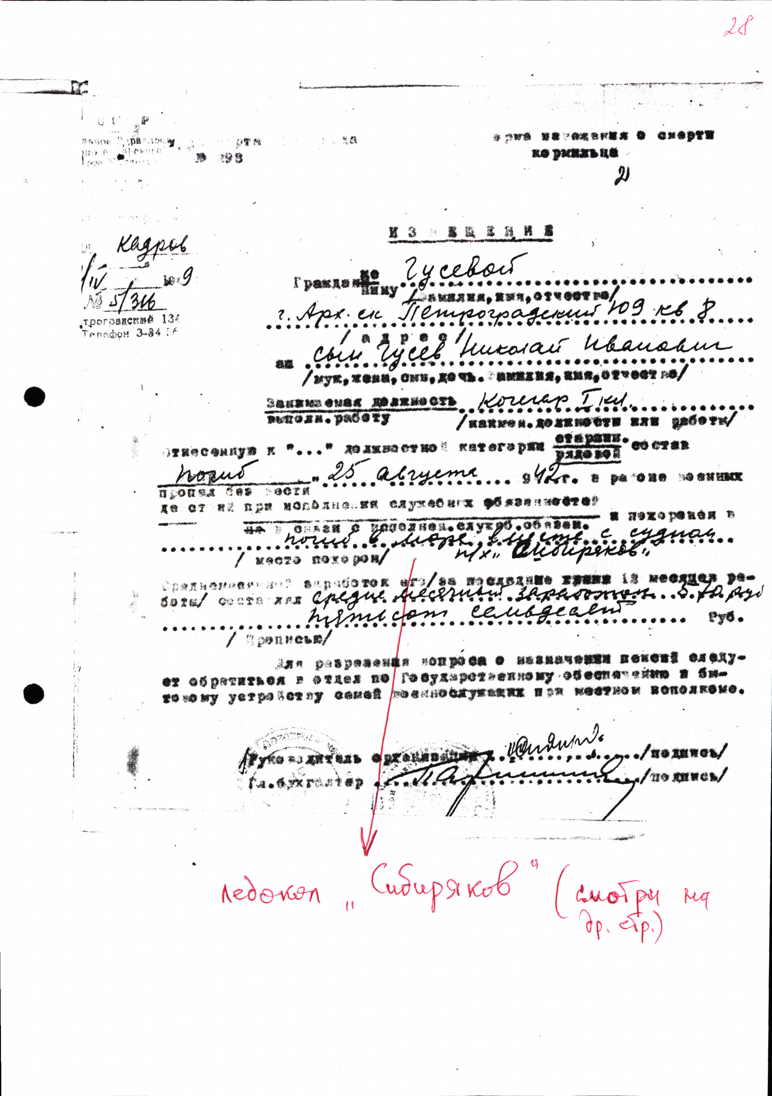 29. Гусев Николай Иванович, год рождения – 1913; должность (специальность) – кочегар I кл., л/п «А. Сибиряков» (ЛД-6); по какой причине, где и когда выбыл – погиб 25.08.1942 г. в Карском море при гибели л/п «А. Сибиряков» (ЛД-6) в результате боя с немецким рейдером «Адмирал Шеер»; место погребения – море, вместе с л/п «А. Сибиряков»; родственники (адрес местожительства) – мать, Гусева, г. Архангельск, Петроградский пр-кт, 109, кв. 8; источник информации – ЦВМА, ГААО.