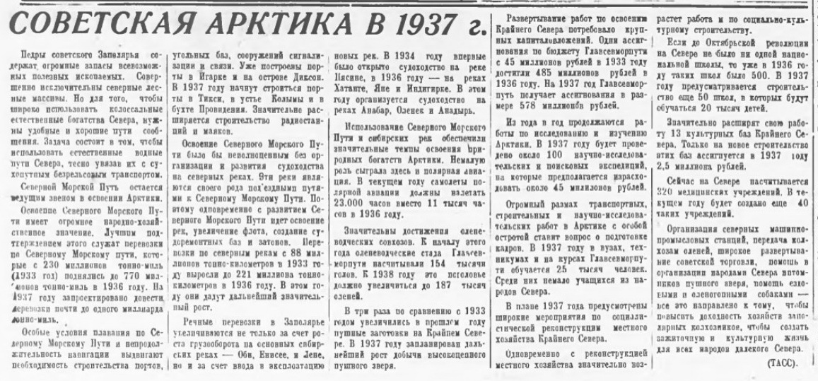 Освоение Северного морского пути имеет огромное народно-хозяйственное значение. Лучшим подтверждением этого служат перевозки но Северному морскому пути, которые с 230 миллионов тонно-миль в 1933 году поднялись до 770 миллионов тонно-миль в 1936 году. На 1937 год запроектировано довести перевозки почти до одного миллиарда тонно-миль.
