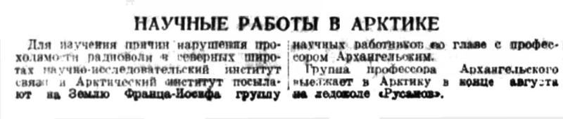 Для изучения причин нарушения проходимости радиоволн в северных широтах научно-исследовательский институт связи и Арктический институт посылают на Землю Франца Иосифа группу научных работников во главе с профессором Архангельским. Группа профессора Архангельского выезжает в Арктику в конце августа на ледоколе "Русанов".