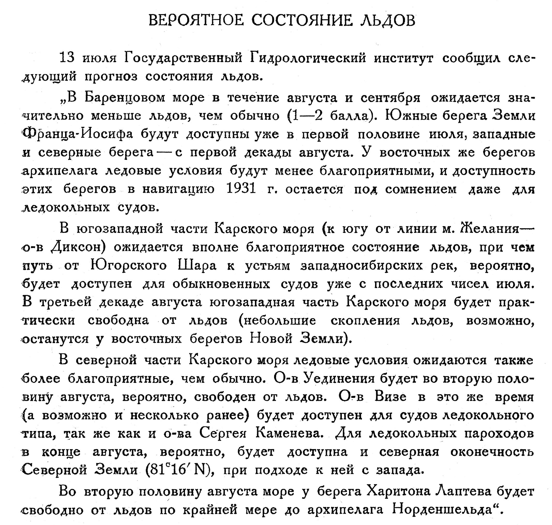 „В Баренцовом море в течение августа и сентября ожидается значительно меньше льдов, чем обычно (1—2 балла). Южные берега Земли Франца-Иосифа будут доступны уже в первой половине июля, западные и северные берега — с первой декады августа. У восточных же берегов архипелага ледовые условия будут менее благоприятными, и доступность этих берегов в навигацию 1931 г. остается под сомнением даже для ледокольных судов.