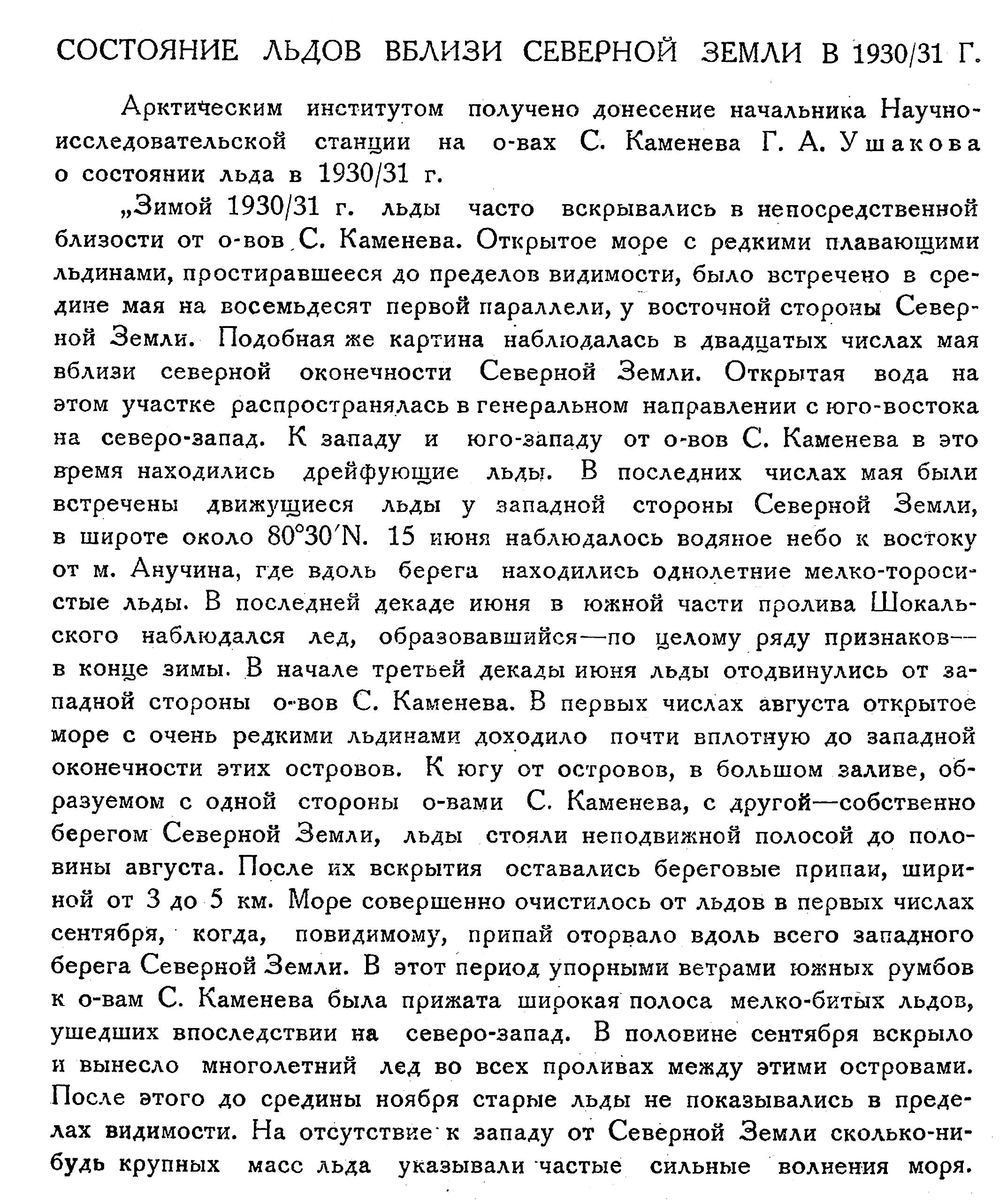 „Зимой 1930/31 г. льды часто вскрывались в непосредственной близости от о-вов С. Каменева. Открытое море с редкими плавающими льдинами, простиравшееся до пределов видимости, было встречено в средине мая на восемьдесят первой параллели, у восточной стороны Северной Земли. Подобная же картина наблюдалась в двадцатых числах мая вблизи северной оконечности Северной Земли. Открытая вода на этом участке распространялась в генеральном направлении с юго-востока на северо-запад. К западу и юго-западу от о-вов С. Каменева в это время находились дрейфующие льды. В последних числах мая были встречены движущиеся льды у западной стороны Северной Земли, в широте около 80°30'N. 15 июня наблюдалось водяное небо к востоку от м. Анучина, где вдоль берега находились однолетние мелко-торосистые льды. В последней декаде июня в южной части пролива Шокальского наблюдался лед, образовавшийся—по целому ряду признаков— в конце зимы. В начале третьей декады июня льды отодвинулись от западной стороны о-вов С. Каменева. В первых числах августа открытое море с очень редкими льдинами доходило почти вплотную до западной оконечности этих островов. К югу от островов, в большом заливе, образуемом с одной стороны о-вами С. Каменева, с другой—собственно берегом Северной Земли, льды стояли неподвижной полосой до половины августа. После их вскрытия оставались береговые припаи, шириной от 3 до 5 км. Море совершенно очистилось от льдов в первых числах сентября, когда, повидимому, припай оторвало вдоль всего западного берега Северной Земли. В этот период упорными ветрами южных румбов к о-вам С. Каменева была прижата широкая полоса мелко-битых льдов, ушедших впоследствии на северо-запад. В половине сентября вскрыло и вынесло многолетний лед во всех проливах между этими островами. После этого до средины ноября старые льды не показывались в пределах видимости. На отсутствие к западу от Северной Земли сколько-нибудь крупных масс льда указывали частые сильные волнения моря.