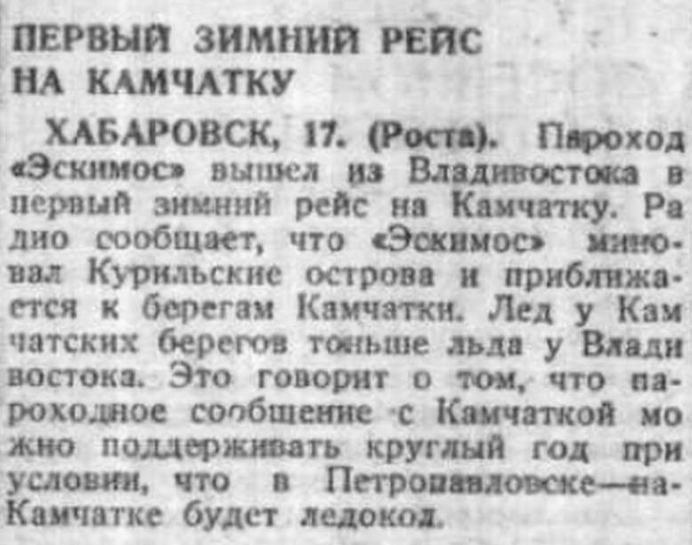 ХАБАРОВСК, 17. (Роста). Пароход "Эскимос" вышел из Владивостока в первый зимний рейс на Камчатку. Радио сообщает, что "Эскимос" миновал Курильские острова и приближается к берегам Камчатки. Лед у Камчатских берегов тоньше льда у Владивостока. Это говорит о том, что пароходное сообщение с Камчаткой можно поддерживать круглый год при условии, что в Петропавловске-на-Камчатке будет ледокол