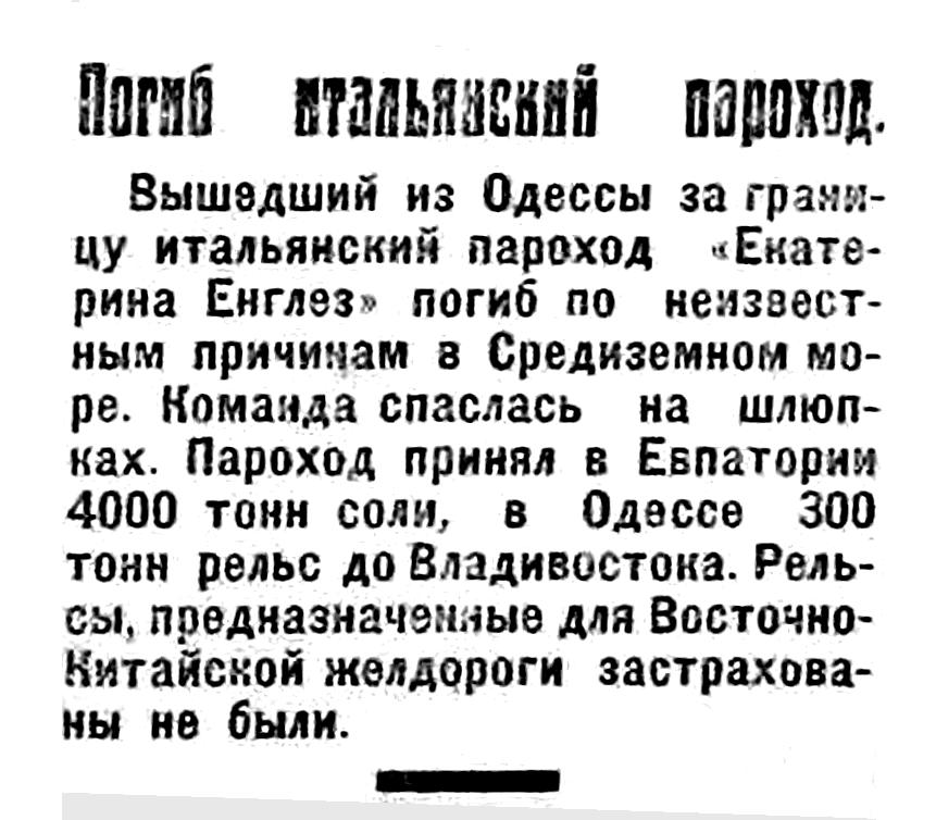 Вышедший из Одессы за границу итальянский пароход «Екатерина Енглез» погиб по неизвестным причинам в Средиземном море. Команда спаслась на шлюпках. Пароход принял в Евпатории 4000 тонн соли, в Одессе 300 тонн рельс до Владивостока. Рельсы, предназначенные для Восточно-Китайской желдороги застрахованы не были.