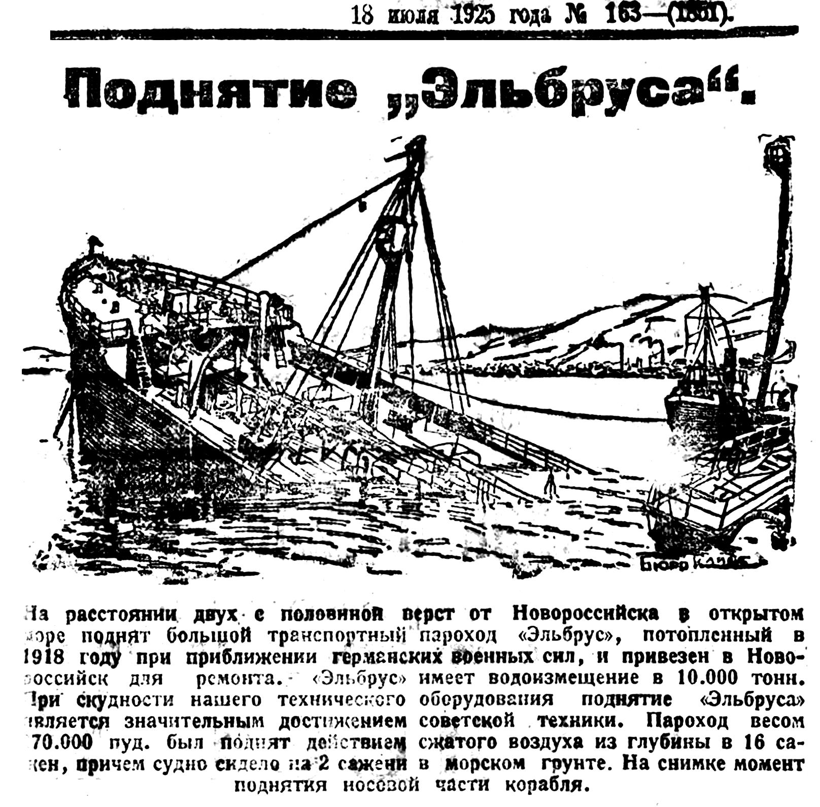 На расстоянии двух с половиной верст от Новороссийска в открытом море поднят большой транспортный пароход «Эльбрус», потопленный в 1918 году при приближении германских военных сил, и привезен в Новороссийск для ремонта. "Эльбрус" имеет водоизмещение в 10. 000 тонн. При скудности нашего технического оборудования поднятие «Эльбруса» является значительным достижением советской техники. Пароход весом 70. 000 пуд. был поднят действием сжатого воздуха из глубины в 16 сажен, причем судно сидело на 2 сажени в морском грунте. На снимке момент поднятия носовой части корабля.