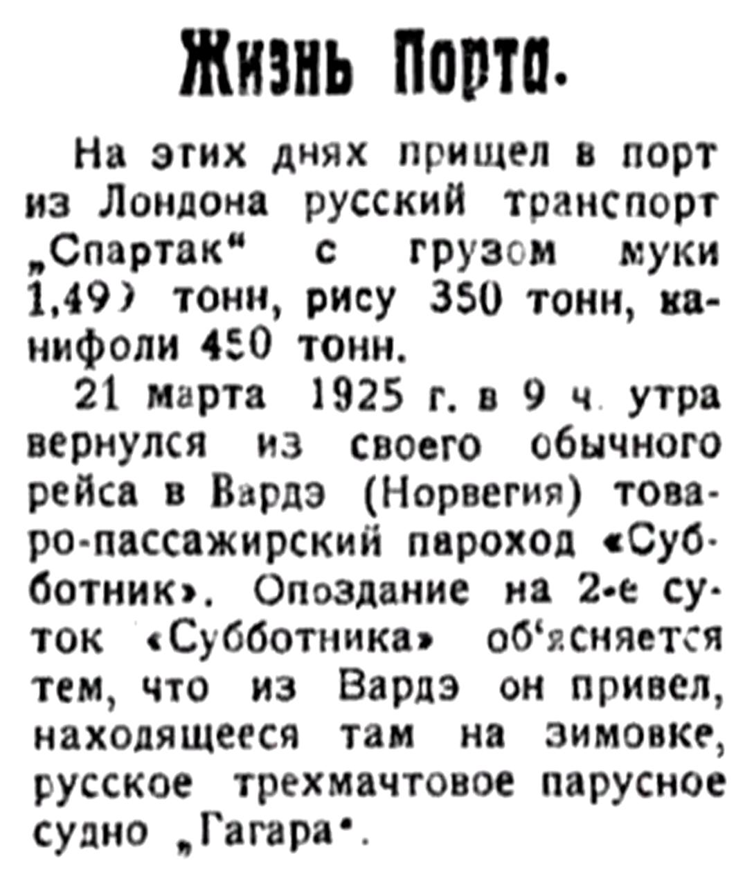 21 марта 1925 г. в 9 ч. утра вернулся из своего обычного рейса в Вардэ (Норвегия) товаро-пассажирский пароход "Субботник". Опоздание на 2-е суток "Субботника" объясняется тем, что из Вардэ он привел, находящееся там на зимовке, русское трехмачтовое парусное судно "Гагара".