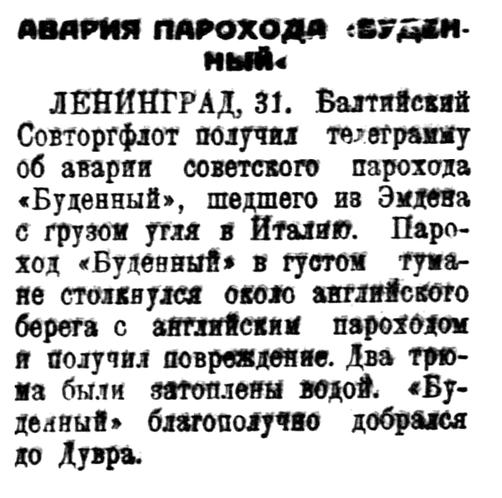 ЛЕНИНГРАД, 31. Балтийский Совторгфлот получил телеграмму об аварии советского парохода «Буденный», шедшего из Эмдеyа с грузов угля в Италию. Пароход "Буденный" в густом тумане столкнулся около английского берега с английский пароходом и получил повреждения. Два трюма были затоплены водой. "Буденный" благополучие добрался до Дувра.