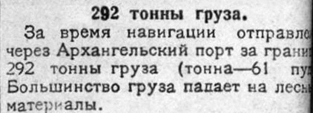 За время навигации отправлено через Архангельский порт за границу 292 тонны груза (тонна—61 пуд). Большинство груза падает на лесные материалы.