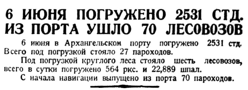 6 июня в Архангельском порту погружено 2531 стд. Всего под погрузкой стояло 27 пароходов.