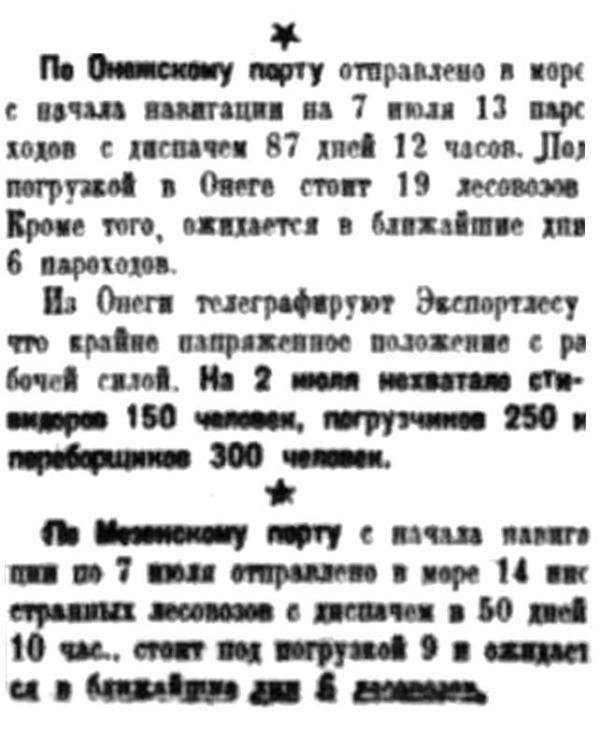 По Онежскому порту отправлено в море с начала навигации на 7 июля 13 пароходов с диспачем 87 дней 12 часов. Под погрузкой в Онеге стоит 19 лесовозов. Кроме того, ожидаются в ближайшие дни 6 пароходов.