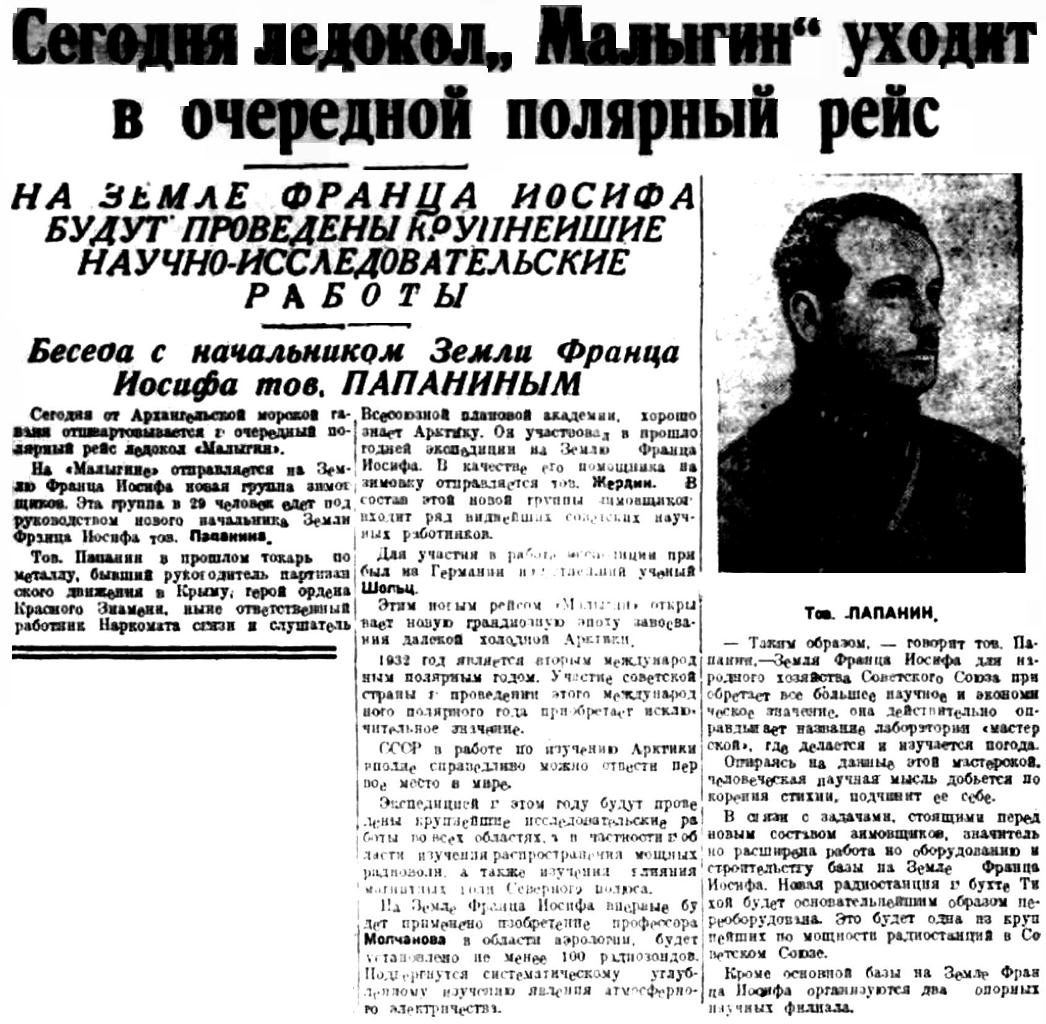 На "Малыгине" отправляется на Землю Франца Иосифа новая группа зимовщиков. Эта группа в 29 человек едет под руководством нового начальника Земли Франца Иосифа тов. Папанина.