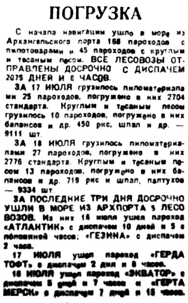 ЗА ПОСЛЕДНИЕ ТРИ ДНЯ ДОСРОЧНО УШЛИ В МОРЕ ИЗ АРХПОРТА 5 ЛЕСОВОЗОВ. Из них 15 июля ушел пароход "АТЛАНТИК" с диспачем 10 дней и 5 с половиной часов; "ГЕЗИНА" с диспачем 2 часа.