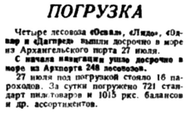27 июля под погрузкой стояло 16 пароходов. За сутки погружено 721 стандарт пилотоваров и 1015 ркс. балансов и др. ассортиментов.