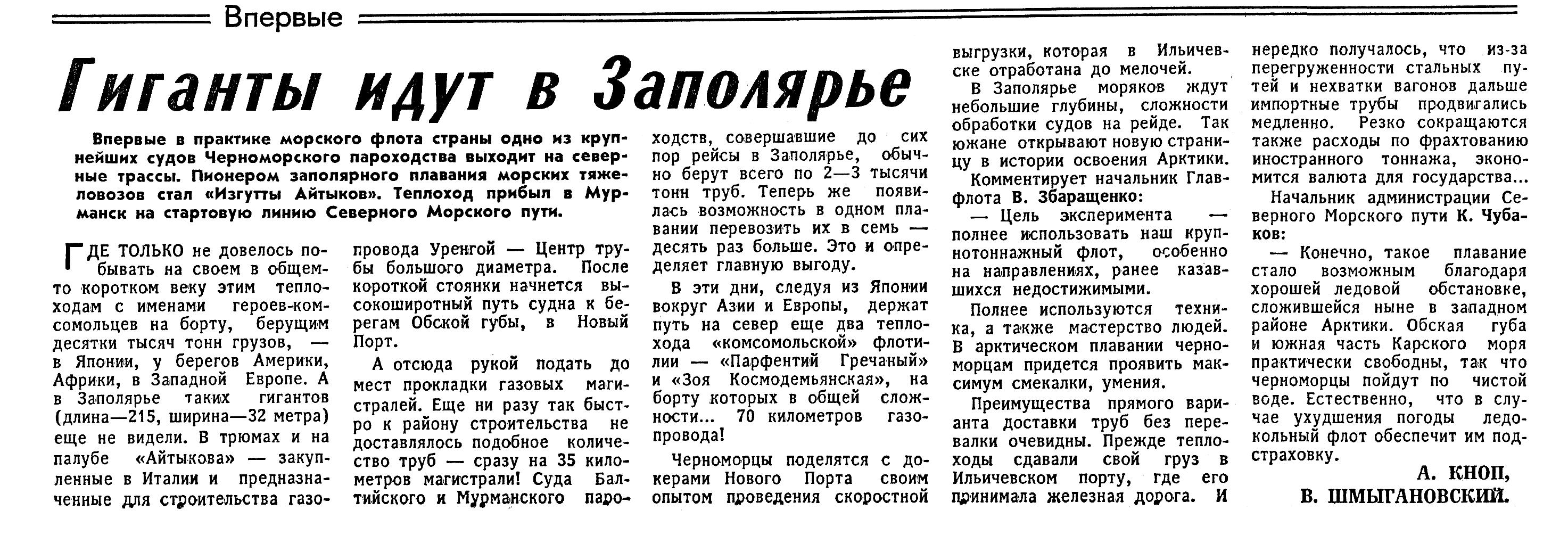 Министерство заблаговременно направило на помощь ледокольной флотилии Дальневосточного пароходства атомоход «Леонид Брежнев», вводило в действие новые мощные транспорты, в том числе и невиданных для Арктики размеров. Весь годовой прирост перевозок труб большого диаметра в Обскую губу, например, был обеспечен всего лишь тремя рейсами судов типа «Зоя Космодемьянская» дедвейтом (полная грузоподъемность) в 50.000 тонн каждое. Здесь нельзя не сказать доброе слово в адрес их экипажей — моряков-черноморцев, впервые, причем очень успешно, поработавших в Арктике.