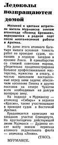 На подходе к Мурманску — атомоход «Сибирь» и ледокол «Красин», также участвовавшие в проводке судов в Восточной Арктике.