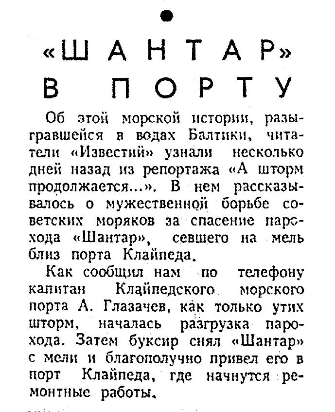 Как сообщил нам по телефону капитан Клайпедского морского порта А. Глазачев, как только утих шторм, началась разгрузка парохода. Затем буксир снял «Шантар» с мели и благополучно привел его в порт Клайпеда, где начнутся ремонтные работы.