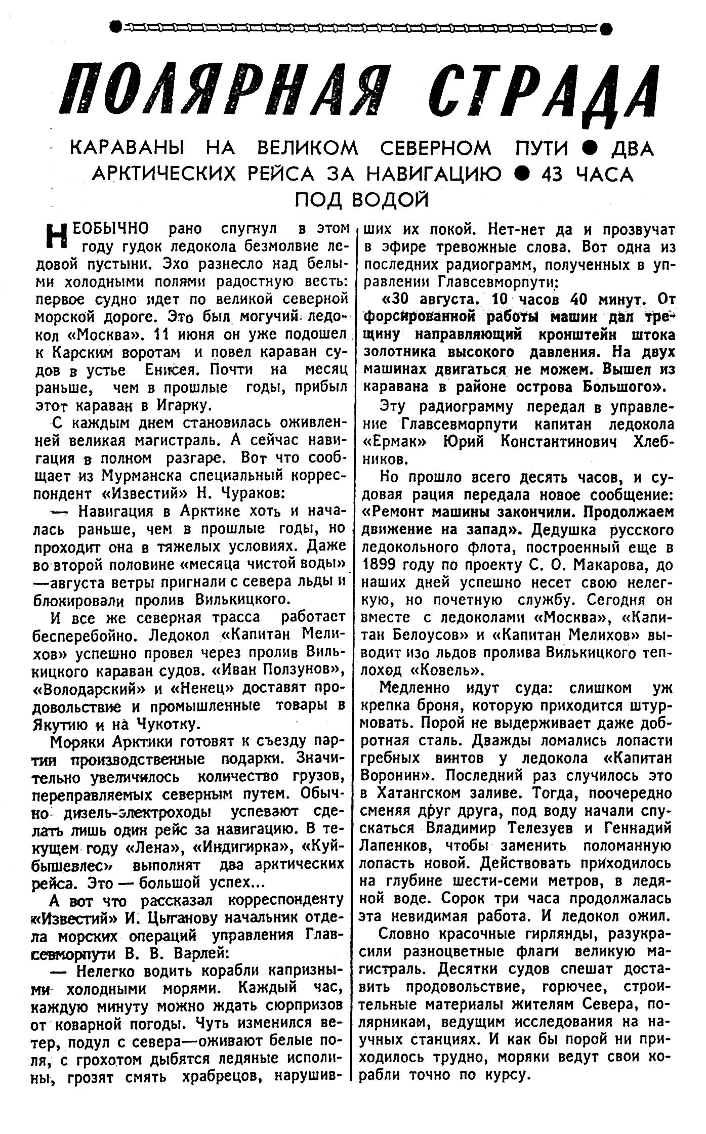 А вот что рассказал корреспонденту «Известий» И. Цыганову начальник отдела морских операций управления Главсевморпути В. В. Варлей: