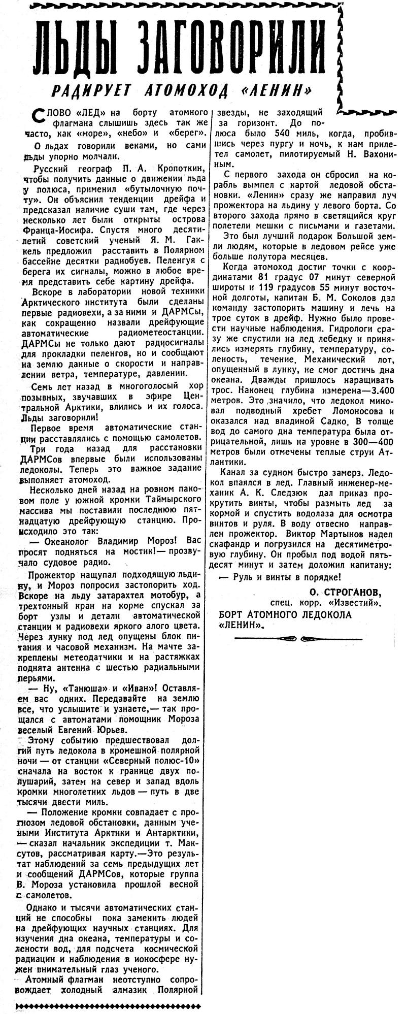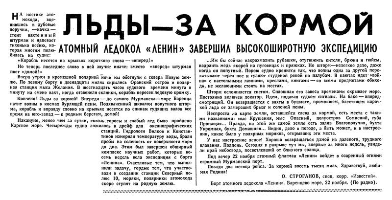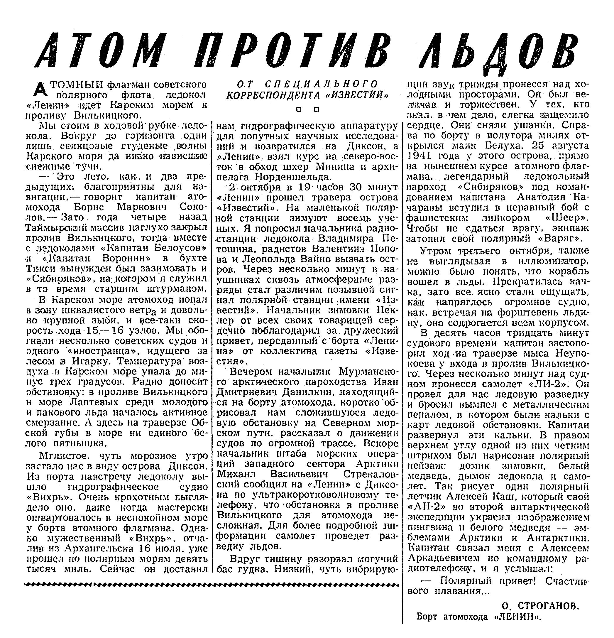 Ровно год назад атомоход «Ленин», возглавивший гигантский караван судов, форсировал льды в проливе Вилькицкого. Небывалая по смелости и размаху морская арктическая операция, которой руководили опытные полярники тт. Стрекаловский, Драницын и капитан-наставник Кононович, закончилась успешно: атомоход под командованием капитана Пономарева вместе с другими мощными ледоколами вывел в морс Лаптевых десятки судов — танкеров, буксиров, грузовых и пассажирских теплоходов для Лены, Колымы и Индигирки.