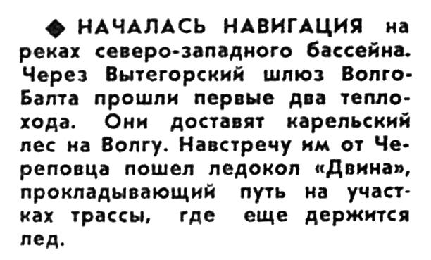 ■ НАЧАЛАСЬ НАВИГАЦИЯ на реках северо-западного бассейна. Через Вытегорский шлюз Волго-Балта прошли первые два теплохода. Они доставят карельский лес на Волгу. Навстречу им от Череповца пошел ледокол «Двина», прокладывающий путь на участках трассы, где еще держится лед.