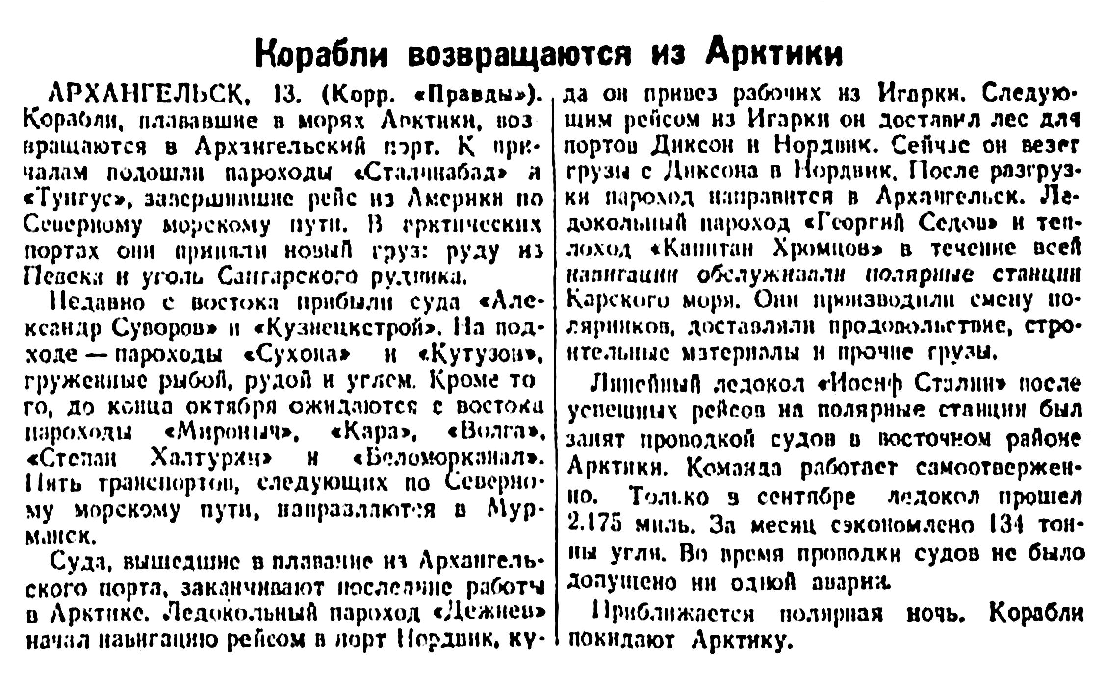 Суда, вышедшие в плавание из Архангельского порта, заканчивают последние работы в Арктике. Ледокольный пароход «Дежнев» начал навигацию рейсом в порт Нордвик, куда он привез рабочих из Игарки. Следующим рейсом из Игарки он доставил лес для портов Диксон и Нордвик. Сейчас он везет грузы с Диксона в Нордвик, После разгрузки пароход направится в Архангельск. Ледокольный пароход «Георгий Седов» и теплоход «Капитан Хромцов» в течение всей навигации обслуживали полярные станции Карского моря. Они производили смену полярников, доставляли продовольствие, строительные материалы и прочие грузы.