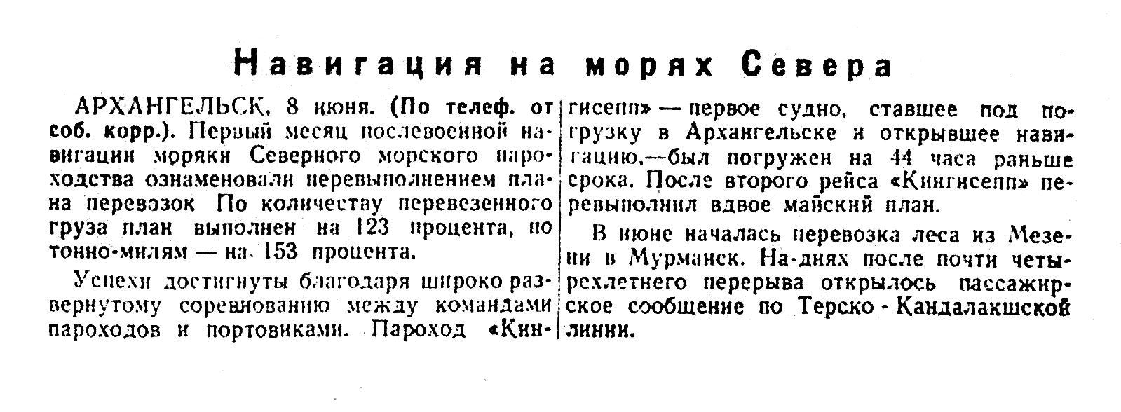 Успехи достигнуты благодаря широко развернутому соревнованию между командами пароходов и портовиками. Пароход «Кингисепп» — первое судно, ставшее под погрузку в Архангельске и открывшее навигацию, — был погружен на 44 часа раньше срока. После второго рейса «Кингисепп» перевыполнил вдвое майский план.