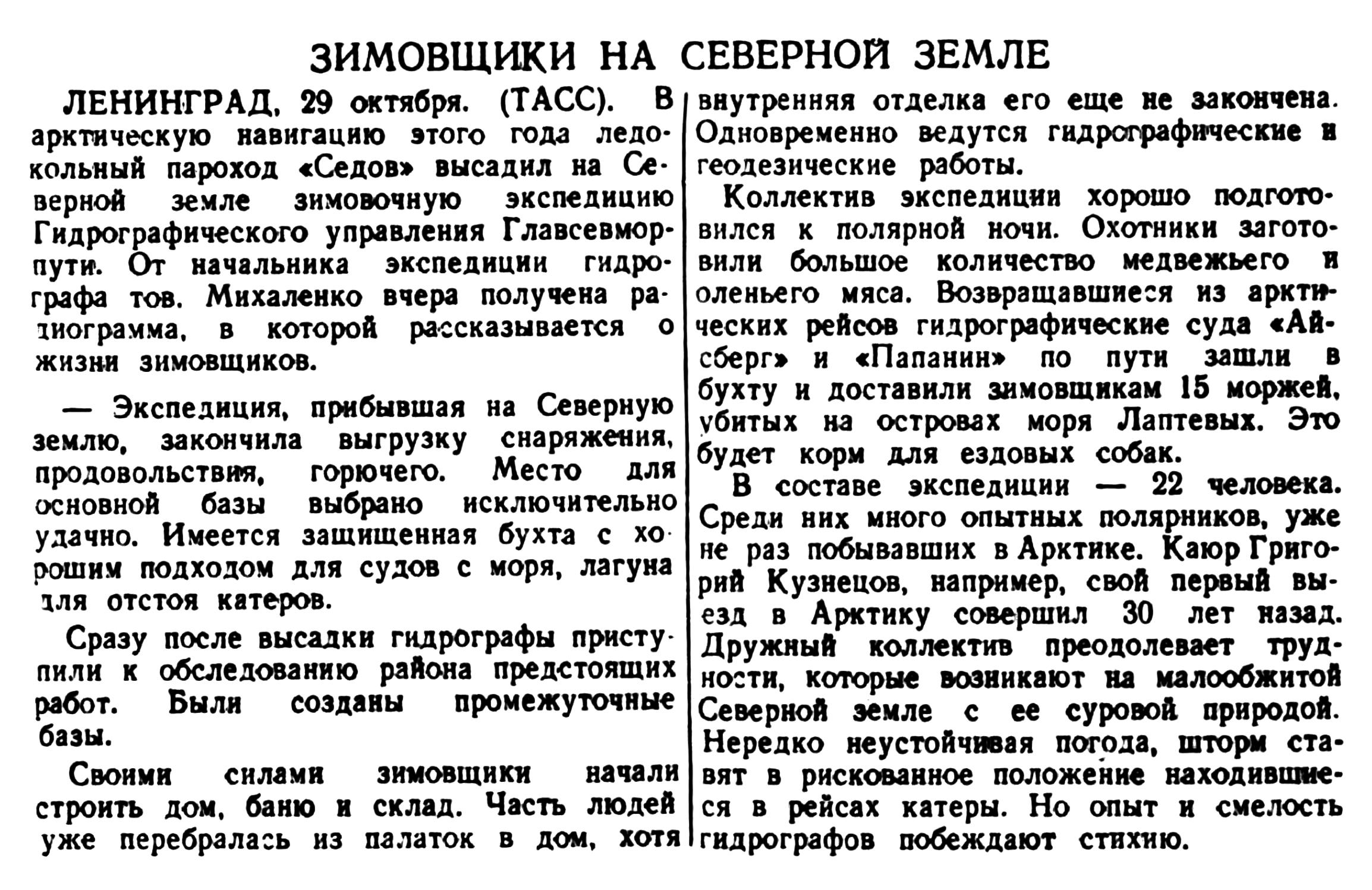 ЛЕНИНГРАД, 29 октября. (ТАСС). В арктическую навигацию этого года ледокольный пароход «Седов» высадил на Северной земле зимовочную экспедицию Гидрографического управления Главсевморпути. От начальника экспедиции гидрографа тов. Михаленко вчера получена радиограмма, в которой рассказывается о жизни зимовщиков.