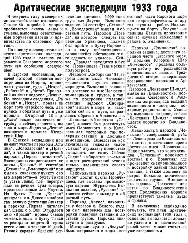 Навигация 1933 г. характеризуется обширными задачами, которые себе поставили Главное Управление Северного морского пути и Всесоюзный Арктический институт — основные органы, работающие в настоящее время в Советской Арктике.