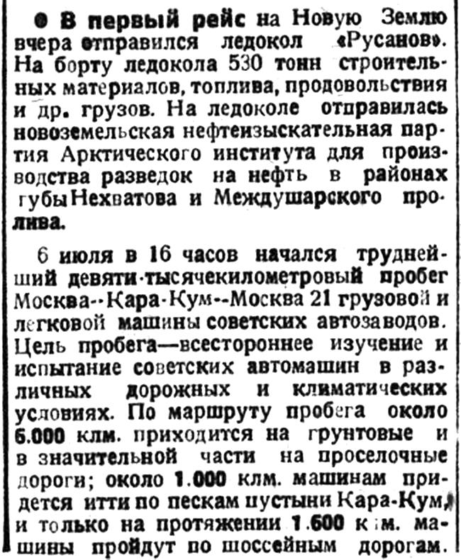 ПЕРВЫЙ РЕЙС НА НОВУЮ ЗЕМЛЮ. Первым рейсом на Новую Землю отправлен 2 июня л/п „Русанов". На ледоколе находится около 530 тонн строительных материалов, топлива, продовольствия и других грузов для снабжения новоземельских становищ. На борту „Русанова" находится нефтеизыскательская партия Арктического института, которая будет вести разведывательные работы в районах, прилегающих к губе Нехватовой и к проливу Междушарскому.
